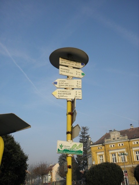 Turistický rozcestník, který se nachází na Náměstí osvobození ve Cvikově, ukazuje turistům cestu do tří směrů. Po modré značce ve směru Česká Lípa, Pihel, U sedmi trpaslíků, Sloup, Radvanec, Údolí Samoty, U posedu…