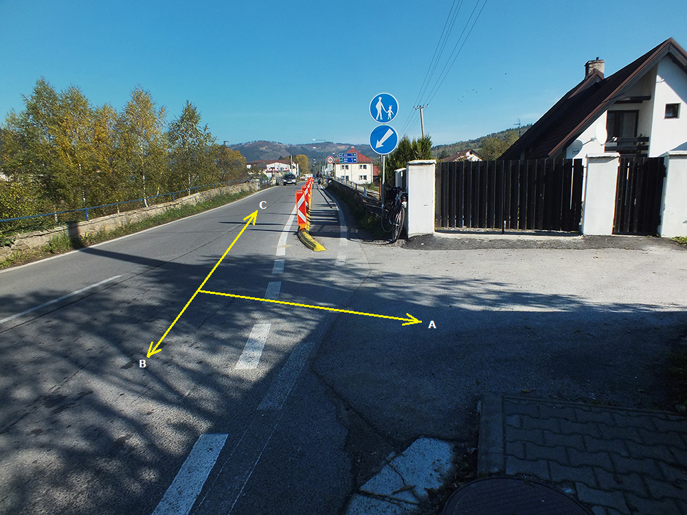 Krásno n.Kys. Kostol Sv. Ondreja. A - cyklotrasa směr Vychylovka, B - cyklotrasa směr kostel. Před budovou s růžovou fasádou zabočit doprava a projet k řece Kysuci.