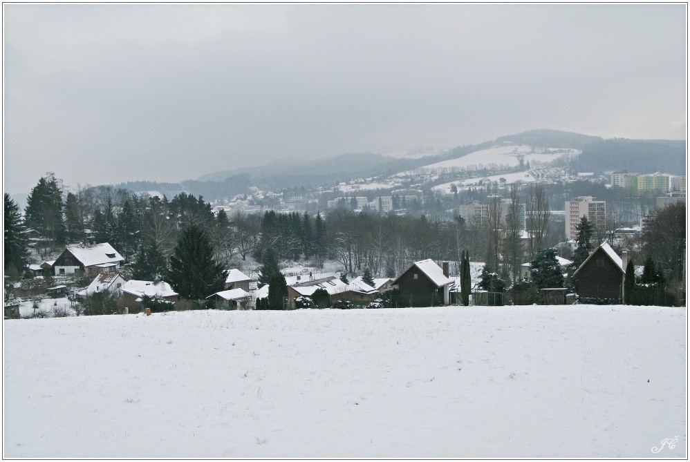 | Pokud byste si chtěli trasu zkrátit a jeli do Náchoda vlakem, je možné začít trasu zde. Od zastávky vyjdeme ještě kousek po asfaltu za poslední domek a pak už stoupáme loukami ke Kramolně (foto 2). Jsou zde krásné výhledy na Náchod a protější kopce (Dobrošov), jen musíte mít lepší počasí, než jsme měli my (foto 1). | ||||