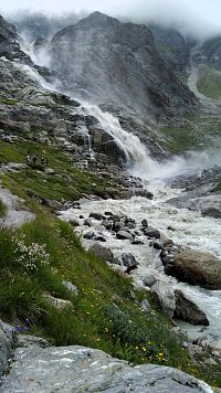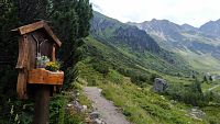 Vycházím od konečné stanice místního autobusu v Mittelbergu. Končí zde také silnice. Červeně značená Pitztaler Sagensteig nebo také Stezka legend se klikatí po alpských loukách ve svahu přes tři tisíce metrů vysokých vrcholů Stolzeru k horské chatě Gletscherstube.