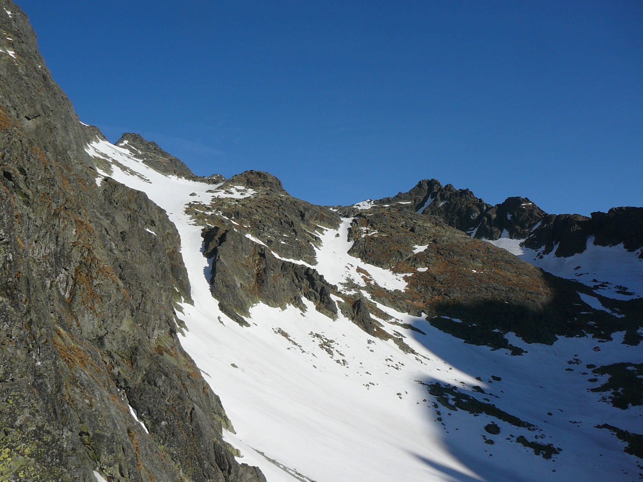 Z Lavinové lávky se musí sestoupit níže na trasu z Velické próby nebo lézt přes Kotlový štít (IV UIAA, lze jít i po sněhových polích výše nad "normálkou"). Poměrně složitě se přechází horizontálně přes několik žeber a obvykle i sněhové pole. Často jsou skály zajištěny smyčkami. Pro neznalé je nutné jištění (sestup do "prázdna"). Náročným traverzem se až na jeho konci, po sestupu z posledního žlabu, dostaneme na dohled Gerlachu. 2,5 hod. (viz níže)