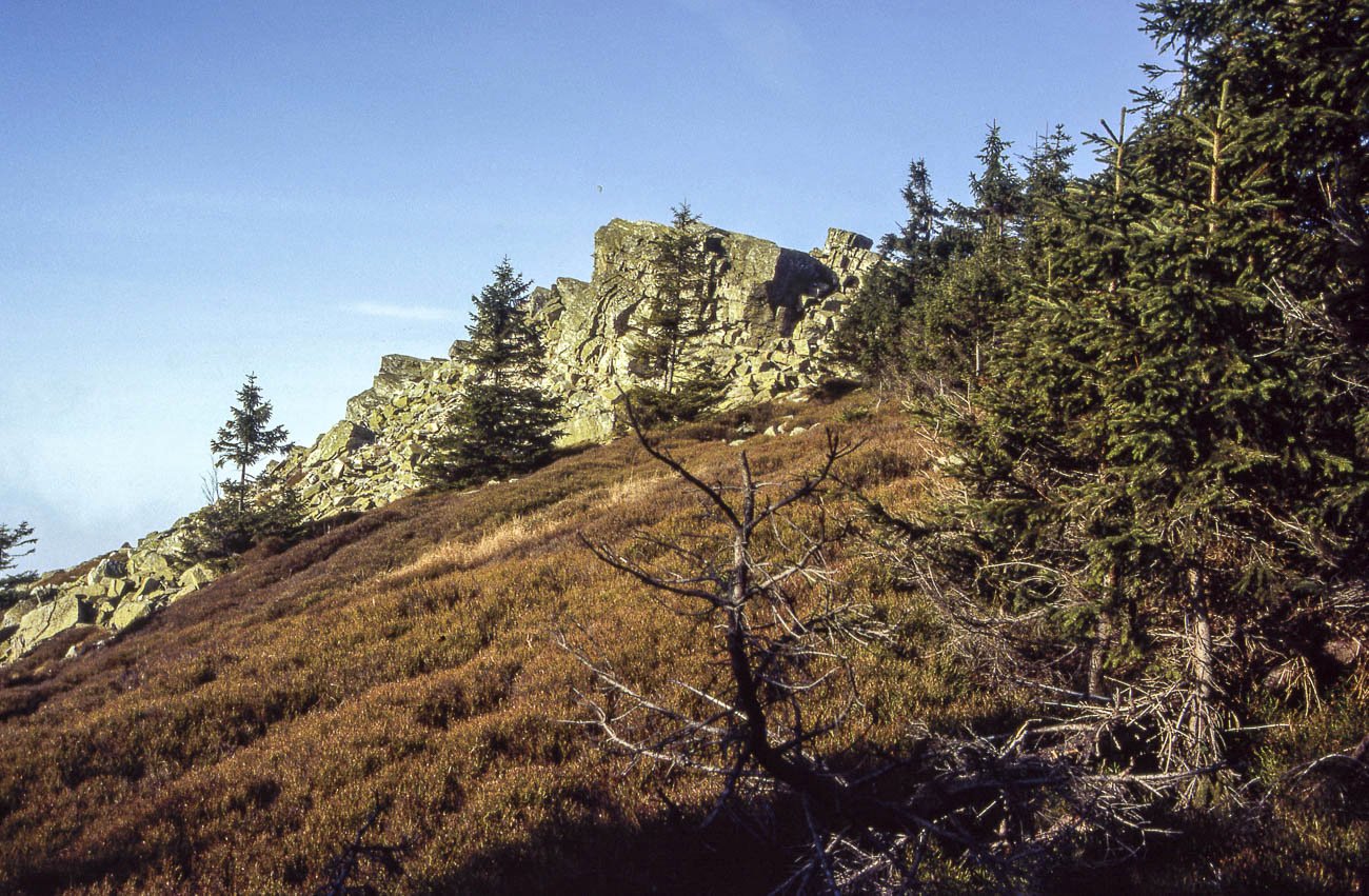 Takže tady ukázková inverze z roku 2003, podle popisu z listopadu, takže to vychází jak vypadala taková inverze před 16 lety. Jakožto domorodec mám samozřejmě blíž ty Jeseníky, takže logicky nejvíc jezdím tam. Foto zhruba od Ztracených kamenů po Františkovu myslivnu, tedy mimo to Pec, Pecný, Břidličná, Jelení studánka. To by značilo trasu ze Skřítku po zelené, je to stálé stoupání zhruba na ty Ztracáky, sice počátek k rozcestí Nad Skřítkem je vlastně rovina, pak se ale leze v kuse nějakých 5 km. Stoupání se mírní až za Ztracenými kameny, ale to už jsme skoro na hřebenovce. Přes Pec a Pecný se pokračuje stále po zelené TZ (po tyčovém značení). Na Břidličnou se vlastně nesmí, značená trasa vrchol obchází, ale je tam beztak vyšlapaný chodník a ačkoliv je vlastně v současnosti celá hřebenovka součástí nějaké rezervace (tady přímo rezervace Břidličná), takže na vrchol občas někdo vyleze.