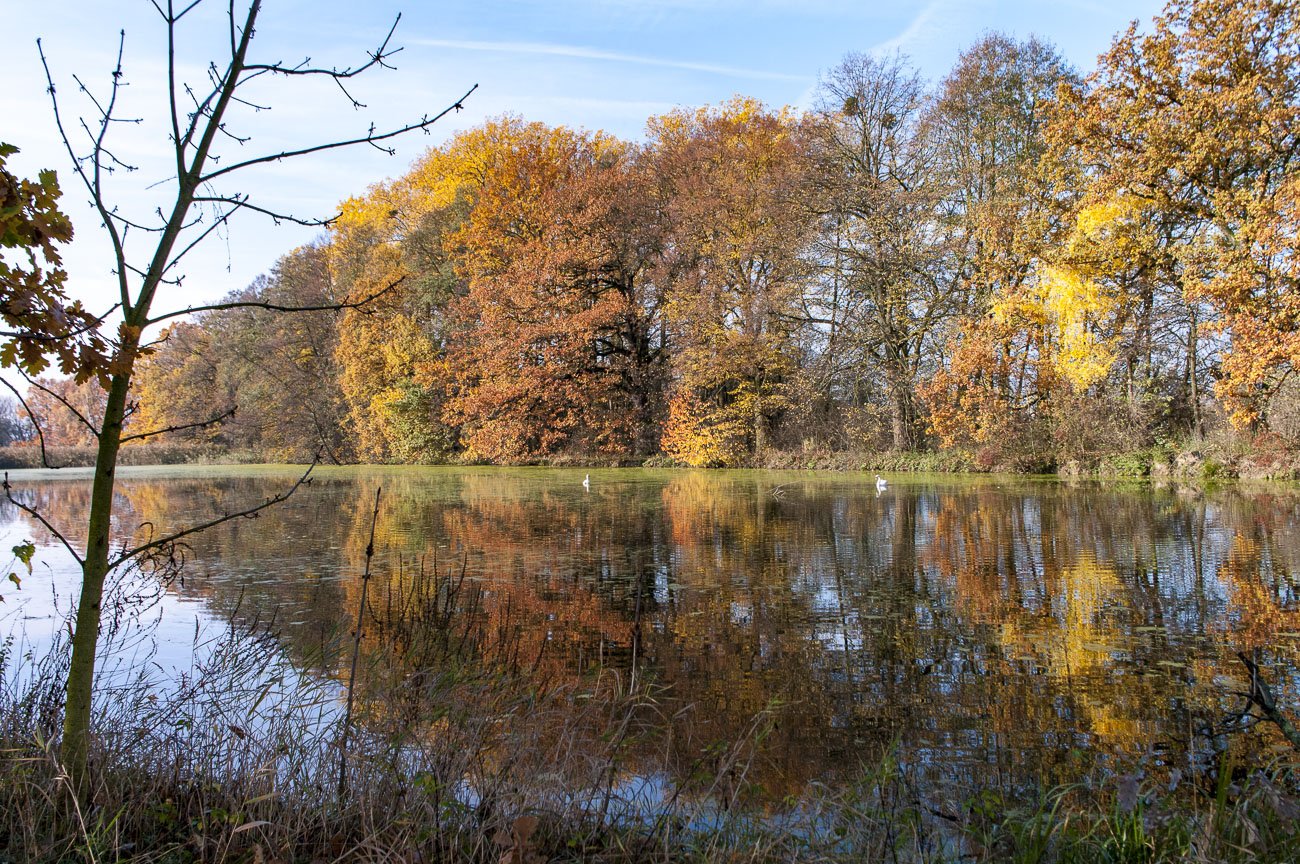 Abych si odpustil vcelku nezáživnou cestu vesnicí (Nový Malín), vezmu to na Třemešek, tedy kolem rybníků, které se už pomalu ukládají k zimnímu lenošení. I dvě labutě na rybníku U lípy nejeví nějaké vzrušení z nějaké lidské přítomnosti a oddávají se jakémusi polospánku na ozářené hladině. Zadní cestou kolem bývalé cihelny a je tu přejezd přes Nový Malín, zhruba ke kostelu je kopec celkem nepatrný, trasa se poněkud zvedá až za železničním přejezdem, ale stále je to po asfaltu v zástavbě horního konce vesnice.