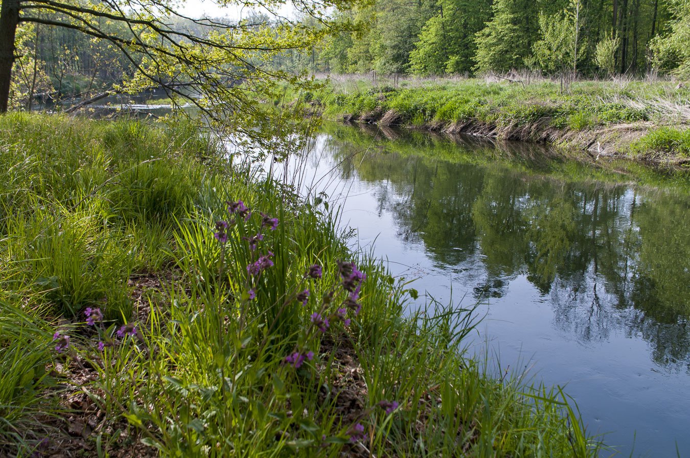 Vlastně jde o to přejet kousek přes silnici č. 446 na polní cestu, která přejíždí nejdříve Benkovský potok, hned za mostem jsme v prostoru CHKO Litovelské Pomoraví. Pár stovek metrů je povrch nezpevněný, ale v lesním porostu už jde o panelku, která se o něco dál mění na normální asfalt. V květnu už je vše celkem rozvinuté, je tu přeci jen ta teplejší střední Morava, oproti našemu „severu“ už klidně o týden rychlejší. První zastávka je u ohbí samotné Moravy. Ač tedy celý duben neprší, ještě je řeka celkem vodnatá, což nalepšují zbytky sněhu z hor (ačkoliv i toho bylo letos málo). Po pár metrech dojíždíme k dřevěné lávce, zv. Vietnamská. Je to lávka na ocelových lanech. Ty jsou ale skrytá pod lávkou, jde tedy o nosný systém. Lávka pěkně houpe, což někteří zneužívají k vystrašení spolujezdců. Kola vedeme na druhou stranu, jak jsem si posledně všiml, na druhé straně je lesní cesta, sice rozbitější, ale měl by být sjízdná. Ukazuje se, že až na malou prohlubeň je cesta slušná a na konci lesa, kde projíždí loukou už celkem pěkná cesta. Dojíždíme k silnici mezi Stření a Lhotou nad Moravou, kde vyjíždíme přímo ke křižovatce s navazující cyklotrasou Moravské stezky. Lesní asfaltka je tu narýsovaná podle pravítka. Zatáčka je před odbočkou k Březovému, ale důležitější je křižovatka u mostu přes Bahénku. Je to taková centrální křižovatka, kde si můžeme vybrat dva směry do Litovle. Tentokrát volíme ten západnější k Šargounu. Tam je jeden z Domů přírody Litovelského Pomoraví. Z pochopitelných důvodů je stále zavřený, nicméně máme příležitost za plotem sledovat práci včelaře. Na dohled už je ale samotný Litovel. Město, zvané Hanácké Benátky nedávno spolu se sousedním Uničovem nechvalně proslulo masivním uzavřením, ale podle sdělení cukrářky žádné velké promoření nevzniklo, spíš jen panika (jak to tak chodí). První občerstvení si dáváme ve formě výtečného Café Lunga (obvykle to bývá desítka nebo dvanáctka) a nějakého zákusku. Pod radnicí se dá projet do Šerhovní uličky a ač se u následující Mlýnská před nás postaví zdánlivě neprostupná zástavba u bývalého mlýna, dá se chodbou projít na druhou stranu poblíž autobusového nádraží a železniční zastávky. Přes koleje pokračujeme ke koupališti a zatáčkou k Moravě. Tady teče míň vody, ale to má na svědomí velký jez, který velkou část vody svádí do kanálu ke vodní elektrárně.