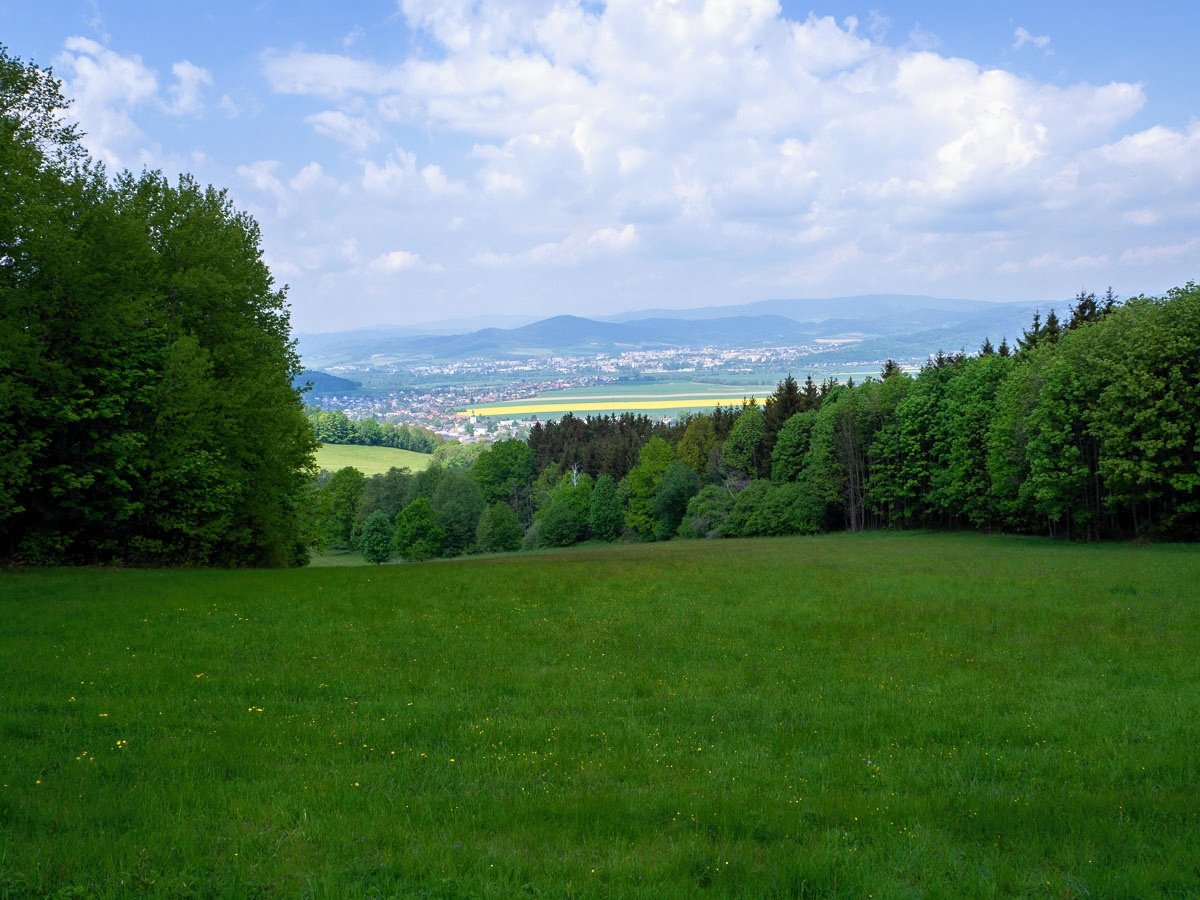 I zde je les zčásti napaden žravým hmyzem, nicméně zbytky lesa ukrývají poměrně velkou Ptačí skálu a již celkem zmlazený les ukrývá nízké skály na úpatí Volyně, které se přičítají ke skalám pásma Mrtvého muže. V rozcestníku, který nese kýžený název se odpojí modrá TZ a stoupá na hřeben, který vrcholí Kamenným vrchem, my pokračujeme již bez značení pohodlnou lesní cestou. I díky kůrovcové těžbě se objevují další výhledy směrem k Rabštejnu a okolním kopcům. Zhruba po 800 metrech jsme u odbočky k vyhlídce. Tady se dvojice přidavších odpoutá. Manželka usoudila, že je důležitější pokračovat přímo do hospody. Takže zase sami dva odbočujeme do většího kopce. Stoupání je zde zase o něco nepříjemnější, takže občas i sesedneme a dopřáváme si volnější chůze. K samotné vyhlídce je to zhruba dalších 800 m a již z loňské zkušenosti je fakt, že poblíž je kamenný mostek s třemi plastovými patníky. Samotný vyhlídka s loveckou chatou je totiž poněkud ukryta za celkem hustým porostem mladších smrčků Paradoxem je, že kolem (tedy před i vzad) je poměrně vzrostlý les, takže na skály by mělo být od cesty normálně vidět. Kola necháváme u cesty a pěšinou stoupáme k samotnému hlavnímu cíli. Chaty jsou tu vlastně dvě, ale ta menší je zřejmě něco jako skladiště, možná dřevník (nemá okna). U té hlavní chaty je železné zábradlí, které vede ke skalní vyhlídce, kterou dekoruje malá skalní špička. Výhled je tu převážně na východní až jižní směry. Pro dnešek sice poněkud ukryté v oparu polojasného dne, ale přesto rozeznávám relativně vzdálený Velký Roudný, mírně na sever krajní hory Velké hřebnenovky. Přímo proti celkem ploše srovnané kopce Nízkého Jeseníku. Místo je to příjemné, takže se i nějakou dobu zdržíme, nicméně hospoda na nás taky čeká. Nějaká dvoustovka metrů ještě čeká k nejvyššímu místu lesní cesty, kde začíná sjezd do serpentiny pod rozcestím Hvězda. Poněkud horší cestička (kořeny a výmoly) je zkratkou k turistickému ukazateli. Tady narážíme na naše dopolední průvodce, kteří už jsou na návratu. My ale máme ještě na Rabštejn necelé 3 km. Okolí Skřítku je samozřejmě již zase celkem hojně navštěvované, takže cesty tu jsou opět pokryty turistickými značkami. Ačkoliv za ta léta bych tu mohl chodit skoro po tmě. Mírný výjezd a pak táhlý sjezd. Nevýhodou je snad jen poněkud více rozježděná cesta, díky těžké technice, která likviduje kůrovcové řádění.