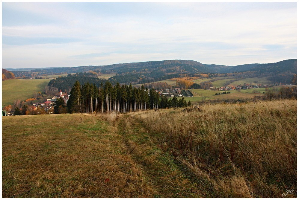 | Modrá značka odbočuje vpravo do Čech, my jdeme dále po žluté značce. Ta vychází z obce, stoupá lesem a pokračuje po loukách nad Pstražnou (foto 9). | ||||