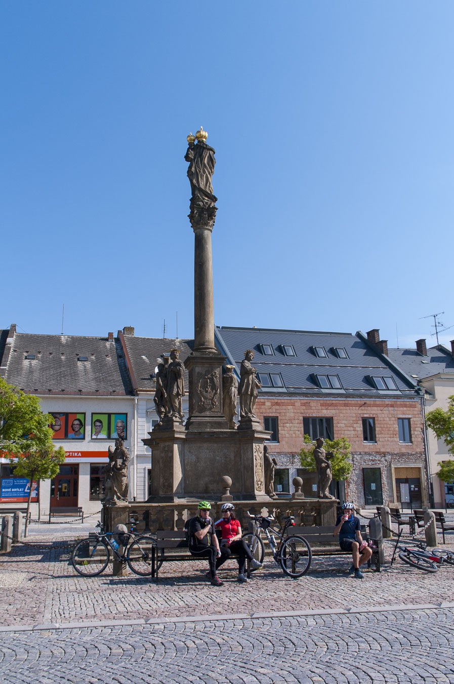 Od nádraží městem do centra. Včera se osvědčila kávička v Litovli a protože jen tak nějaká občerstvovna nebude, malou svačinku si dopřejeme v místní pekárně nějakým koláčem a kávou s automatu. Ty pozřeme na zdejším náměstí, které poměrně nedávno prošlo rekonstrukcí. Střed náměstí zdobí barokní Mariánský sloup, u něj novější litinová kašna s Hygií a o něco dále takřka nová moderní kašna. Obě jsou prozatím bez vody.