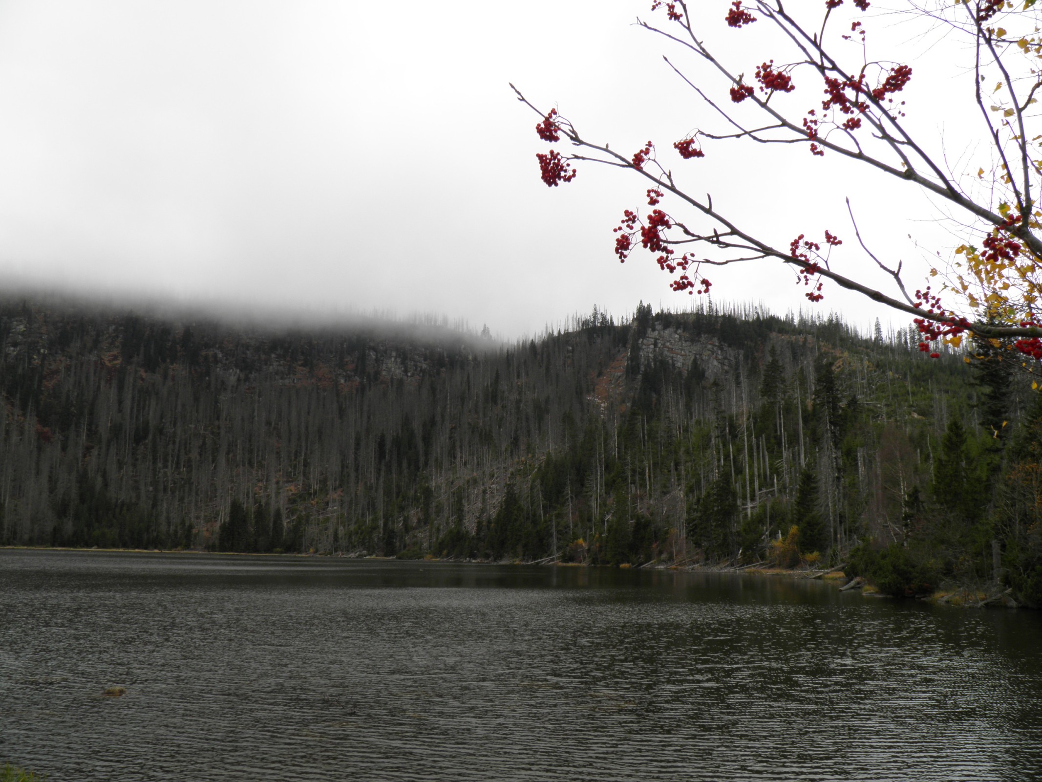 Při našem pobytu na Šumavě jsme samozřejmě měli s sebou i horská kola, která jsme využili k několika výletům. Jedním z nich byl výjezd na Plešné jezero. Byl to sice jen půldenní výlet, ale přesto hezký výjezd. Po obědě v hospodě v Nové Peci jsme vyjeli po cyklostezce č.1026 směrem na Láz a dál jsme pokračovali na Raškov. Tady začala pohodička, protože jsme jeli po rovince podél Schwarzenberského kanálu k Rossbachu. Tady jsme začali pomalu stoupat na Říjiště a dále k Jezerní stezce a nouzovému nocovišti pod Plešným jezerem. Pro pěší je to odsud k jezeru jen 2 km po zelené, ale my jsme pokračovali po cyklostezce 1028 na rozcestí U stříšky. Tady jsme najeli na cyklostezku č. 1029 za začali opravdu stoupat k jezeru. Čekali jsme horší a delší výjezd, ale po lesní asfaltce jsme za chvilku dojeli k jezeru. Bohužel okolní kopce byly v mracích....... Pročetli jsme informační tabule, udělali několik fotek a vyrazili jsme na zpáteční sjezd. Ten vedl stejnou cestou až u Raškova jsme najeli na cyklostezku 1023, která nás dovedla na Klápu. Slabá půlhodinka a byli jsme u auta. Hezký sjezd......