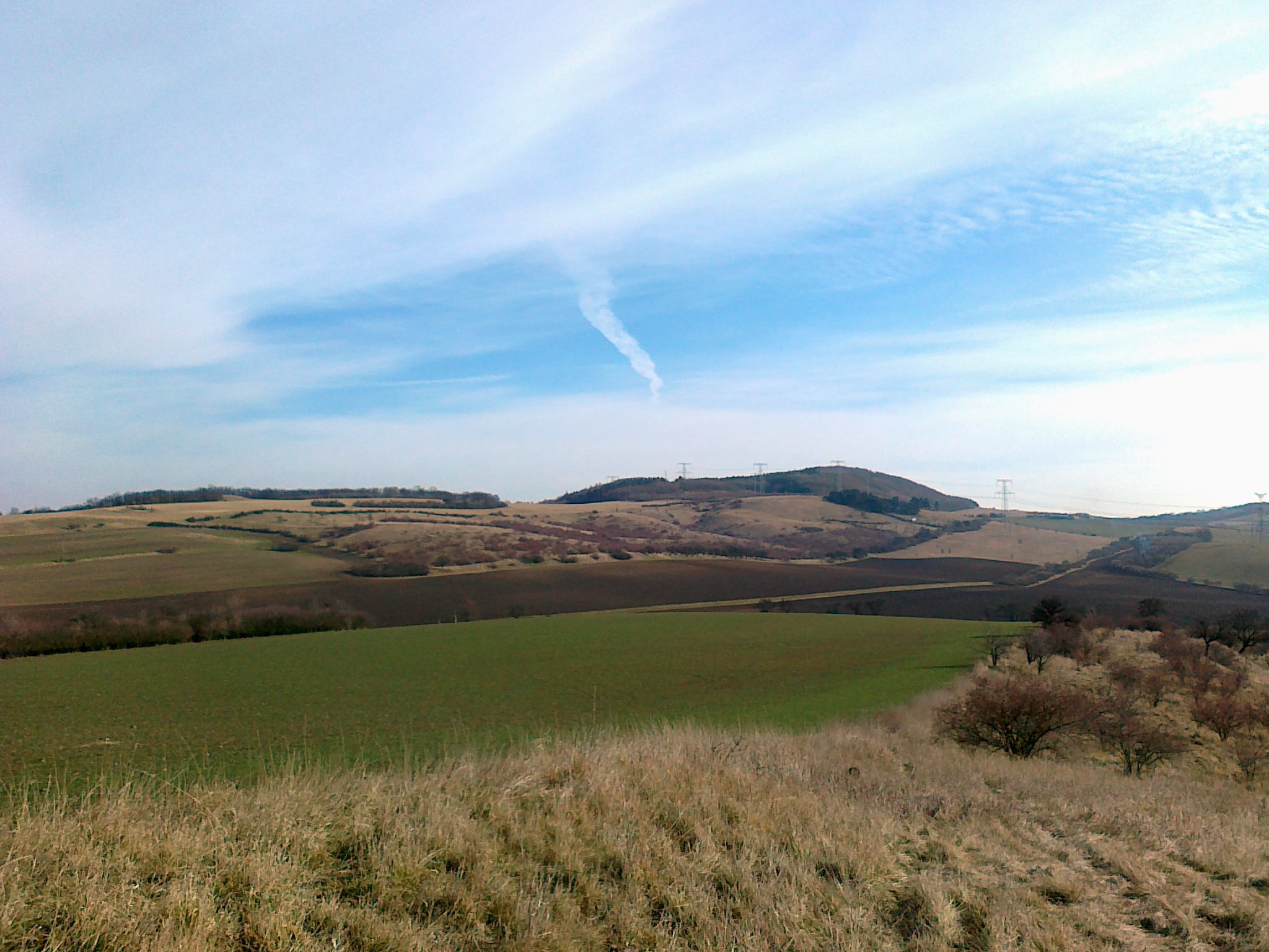 Prudkým svahem, který končí trnitou hradbou scházím pod vedení vysokého napětí. Přecházím na cestu, která vede na rozhraní lesa a pastvin. Cesta vede přes vrch Vinice do Bečova. Je odtud výhled na Krušné Hory a západní část Českého středohoří.