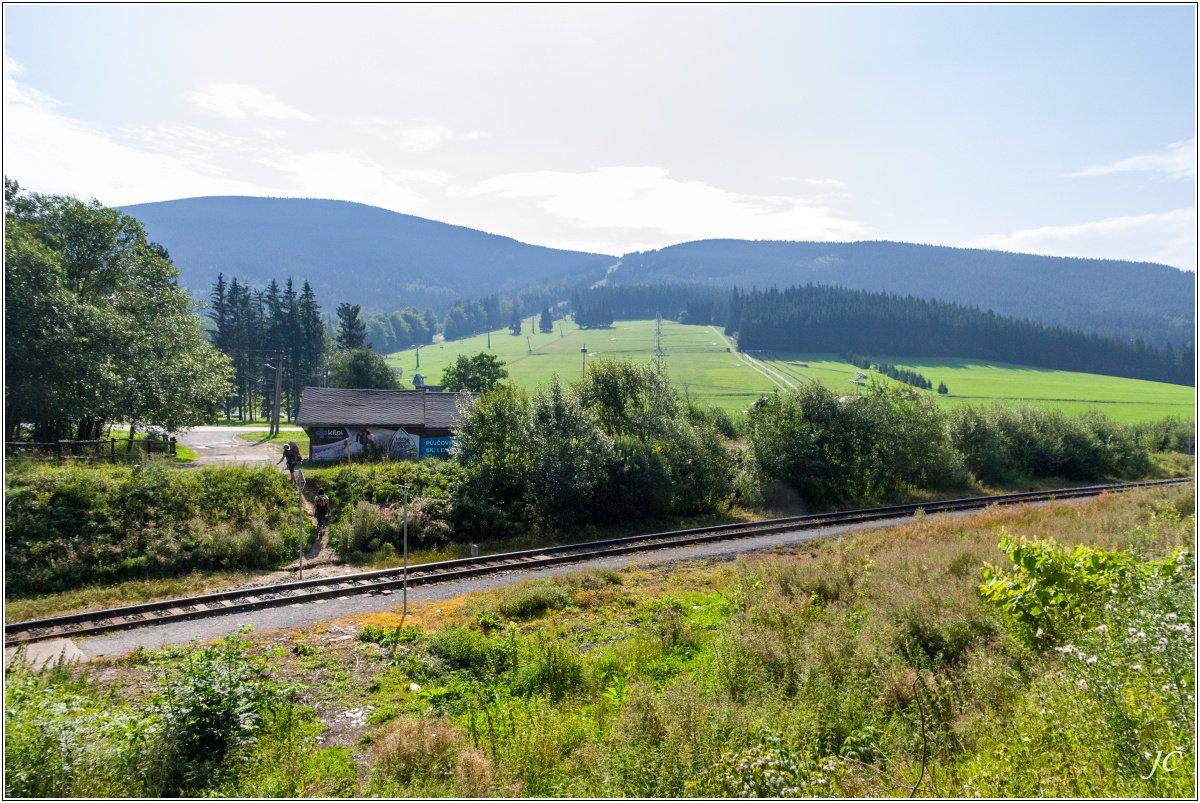 Startovním místem bude Ramzová. Zde musím dát podtrženou jedničku s hvězdičkou Českým drahám, protože frekvence vlaků na místní trati je opravdu skvělá. Z Ramzové se dá na Šerák dostat lanovkou (odkaz), ale po pěším výstupu to pivo nahoře bude chutnat určitě víc. Nejkratší cesta nahoru je značená červeně (jedná se o součást skoro 7000 km dlouhé evropské turistické trasy E3 z Portugalska do Bulharska - to jen tak mimochodem) a tak trochu trasu lanovky kopíruje. Jsou z ní nádherné výhledy, díky nímž si to dlouhé stoupání můžeme snadno rozdělit. Krom toho cestou potkáme kapličku se studánkou (více zde) a na přestupní stanici lanovek na Černavě novou kovovou sochu kamzíka (tady). Za ní, už na úbočí Mračné hory je Koňská vyhlídka. To už jsme těsně pod Šerákem, kde červenou značku opustíme.