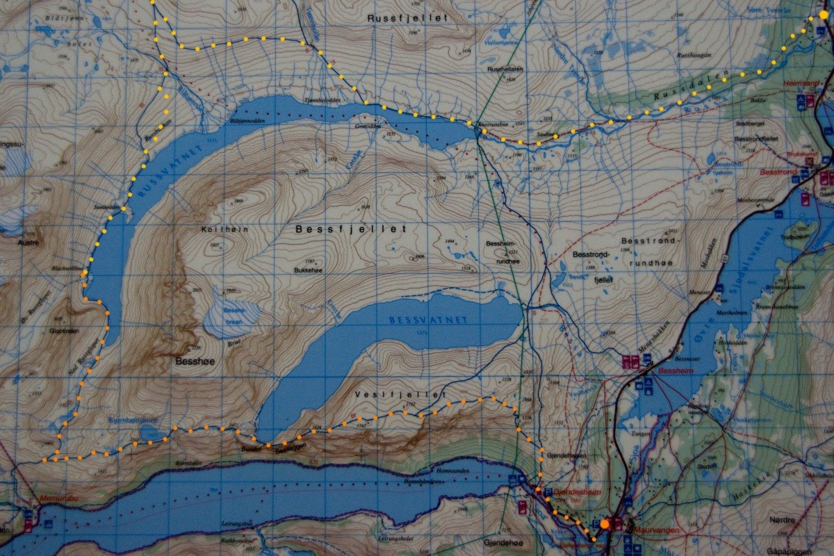 Cesta vede od jezera Gjende, přechází se mezi jezery Gjende a Bessvatnet dál do vnitra parku až k jezeru Russvatnet. To se obchází po jeho vzdálenějším břehu. Cesta zpátky vede podle řeky Russa, která z jezera vytéká a končí na silnici č. 51. Pokud by nebyl nikdo, kdo by zde na vás čekal s autem, pak vás čeká ještě dalších 14 km po silnici (jinudy to asi nejde) k jezeru Gjende – pak už se to snad za dva dny ani stačit nedá.