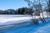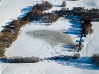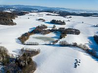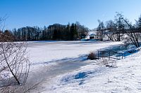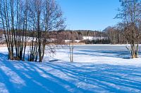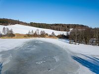 V ostré zatáčce se červené značení otáčí směrem ke Štítům, ale v mírně se zvedající polní cestě navazuje žluté značení k blízkému Sychrovu, což je rybník z roku 1964, který slouží jako chovný a svým způsobem tak trošku i tu „českokanadskou“ krajinu doplňuje. Zamrzlý rybník je i celkem oblíbeným výletním místem místních obyvatel a dokonce jsou kolem k vidění i nějaké čerstvé stopy od běžkařů. Kolem dokola jsou převážně louky a tady se díky malým převýšením a sklonům dá zřejmě obstojně jezdit i na přemrzlém sněhu.