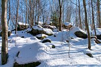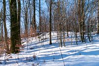 Zvolil jsem si trasu, kterou celkem dobře znám jak z pěších výletů, tak i částečně na kole (horském). Kousek od Kocandy je nástup červené pěší trasy, přesněji Hambálek, jak místní říkají Čertí brána. Společně je vedená silniční cyklotrasa (6229), která je ovšem spíše terénní. Podle rozježděných stop tu v minulém týdnu někdo i běžkoval, ale teď je to rozbité od terénních aut a navíc i přemrzlé. Naštěstí ve zbytku měkčího sněhu se jed celkem dobře. Na zvolené trase nehrozí žádné velké převýšení, cesta se mírně klikatí na úbočích kopců Zábřežské vrchoviny, povětšinou jde o smíšený les, výhledů moc není, kromě míst, kde nechali dřevorubci díru. Určitého vrcholu dosahuje trasa po vrcholem Pustina ve výšce asi 610 nadmořských metrů, pak lesní cesta začne i klesat. Určitou zajímavostí je poblíže značení hřebínek na východní straně pokrytý pásem větších nebo menších balvanů, leckdy i skalek, který může trošku připomíná přeci jen velkolepější úkazy, které jsou známé z oblasti, které se říká Česká Kanada.