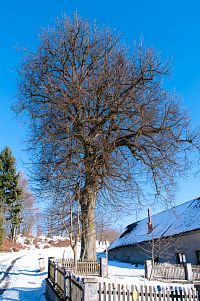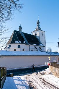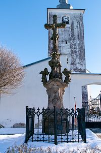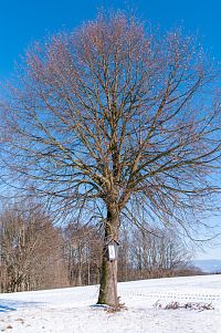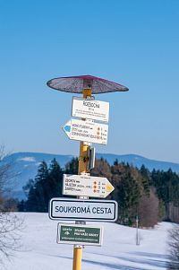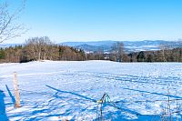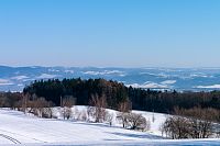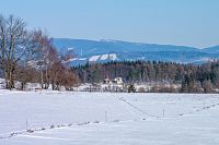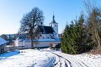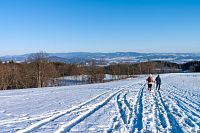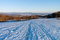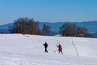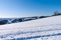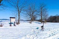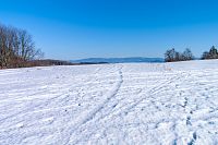 Žlutá značka míří k nedalekým Horním Studénkám, kde je hlavní památkou poutní areál u kostela sv. Linharta (nebo Leonarda). Zde krátká žlutá značka končí, ale náhradou je modré TZ vzhůru k návrší U Příčnice. Tady i potkávám dvojici s běžkami (už jsou ale pěšky), tak se dozvím, že směřují od Zborova a tam to taky celkem po loukách jde. Ona ta celá náhorní louka i dál k Rozsoše si celkem drží poněkud plošší charakter, takže vyznavači úzkých prkének si tu mohou nakroužit nějaké kilometry bez větší námahy.