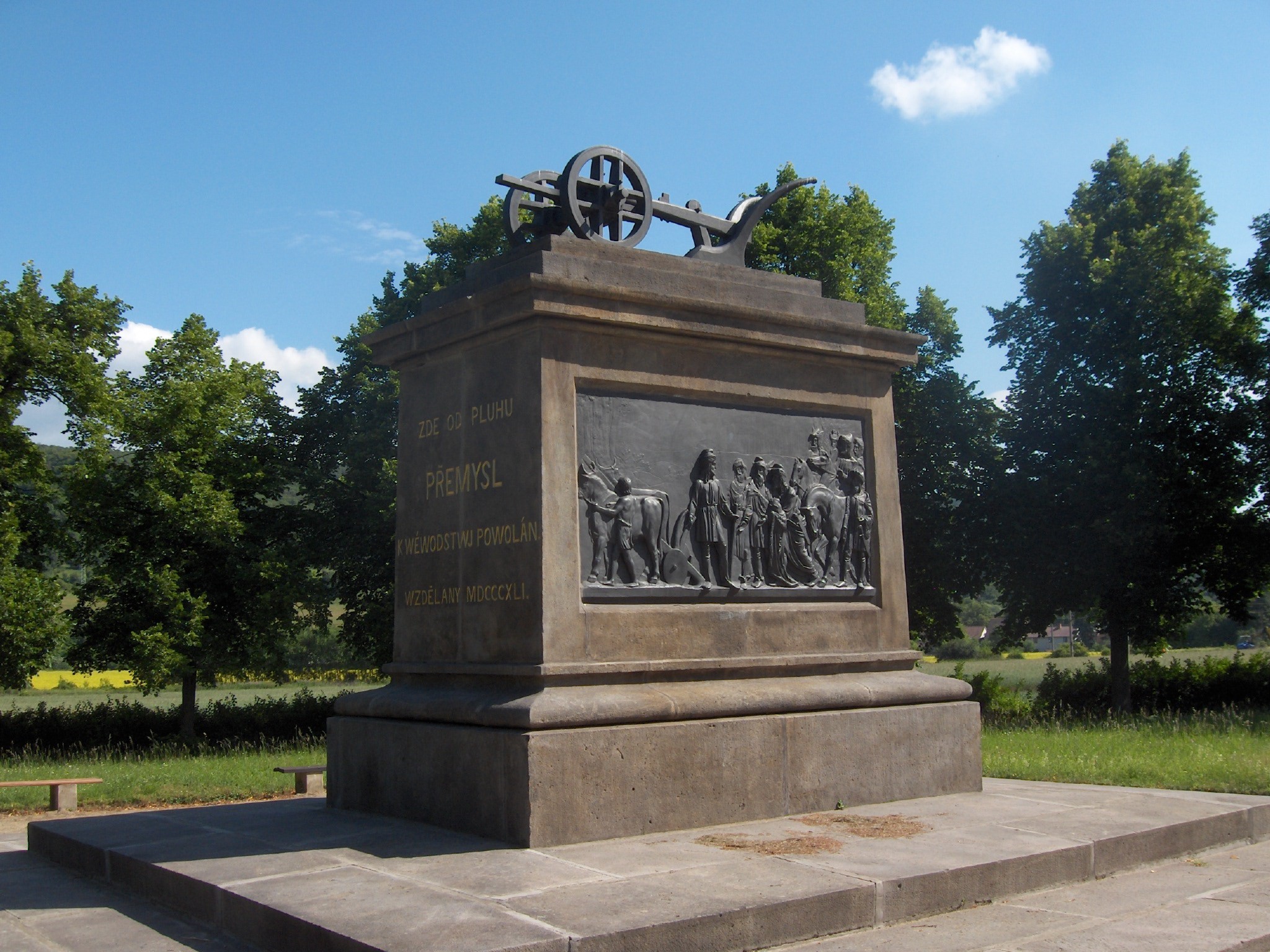 | Národní kulturní památka. Pomník nechal v roce 1841 postavit hrabě Nostic. Na kamenném podstavci stojí pluh a na stranách podstavce jsou reliefy zobrazující setkání Přemysla Oráče s poselstvím od kněžny Libuše a jeho příchod na Vyšehrad. | ||||