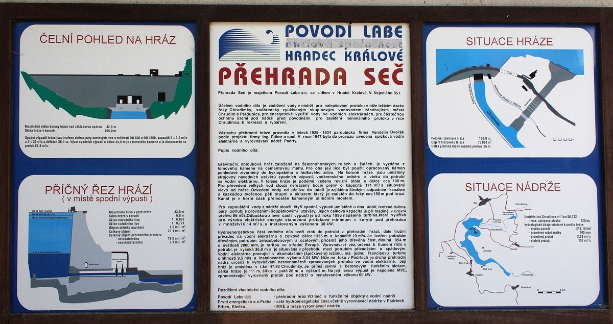Okružní trasa kolem Sečské přehrady (foto 1 - pro souběžné prohlížení fotografií doporučuji otevřít galerii v samostatném okně prohlížeče), vhodná i pro cykloturisty. Nástup na trasu je možný kdekoliv, já jsem vybral rozcestí Sečská přehrada mezi silničním tunelem pod Vildštejnem a kempem U letadla. Zde začíná žlutá značka, vedoucí asi 2 km přímo po pláži přehrady (foto 2 a 3) s výhledem na protější stráň se zbytky hradu Oheb (foto 4). Za pláží odbočuje žlutá v pravém úhlu nízkým lesem vpravo do kopce a chatovou osadou vede k silnici č. 340 Seč - Běstvina . Z ní hned po 150 metrech odbočuje vpravo do Horních Počátek, my však ještě 200 m silnice vydržíme a sejdeme k červené značce, vedoucí do Hoješína. Jde se opět mezi chatami, později lesem a po břehu Seče. Před Hoješínem se můžeme zastavit na malém židovském hřbitově (foto 5) s hezkým výhledem na Seč. Těsně za Hoješínem je výletní hospůdka Pod drnem (foto 6, foceno večer v lijáku), výborné občerstvení hlavně večer. Po červené pokračujeme dále po břehu (foto 7) lesem k Březinkám, odkud je vidět horní konec přehrady. Vystoupáme do kopce do Klokočova (foto 8), opustíme červenou a dáme se po žluté pro změnu z kopce k chatě Na Pilce (foto 9). Po lávce přejdeme Chrudimku a na rozcestí odbočíme vlevo po modré. Ta nás dovede zprvu mezi skalami, později lesem do chatové osady Ústupky a za ní vystoupáme na zříceninu hradu Oheb (foto 10 - 13). Po prohlídce a kochání se výhledem na přehradu (foto 14 a 15) sejdeme z prudkého kopce na silnici a po zelené se přes hráz přehrady a tunelem (foto 16) dostaneme na výchozí místo.
