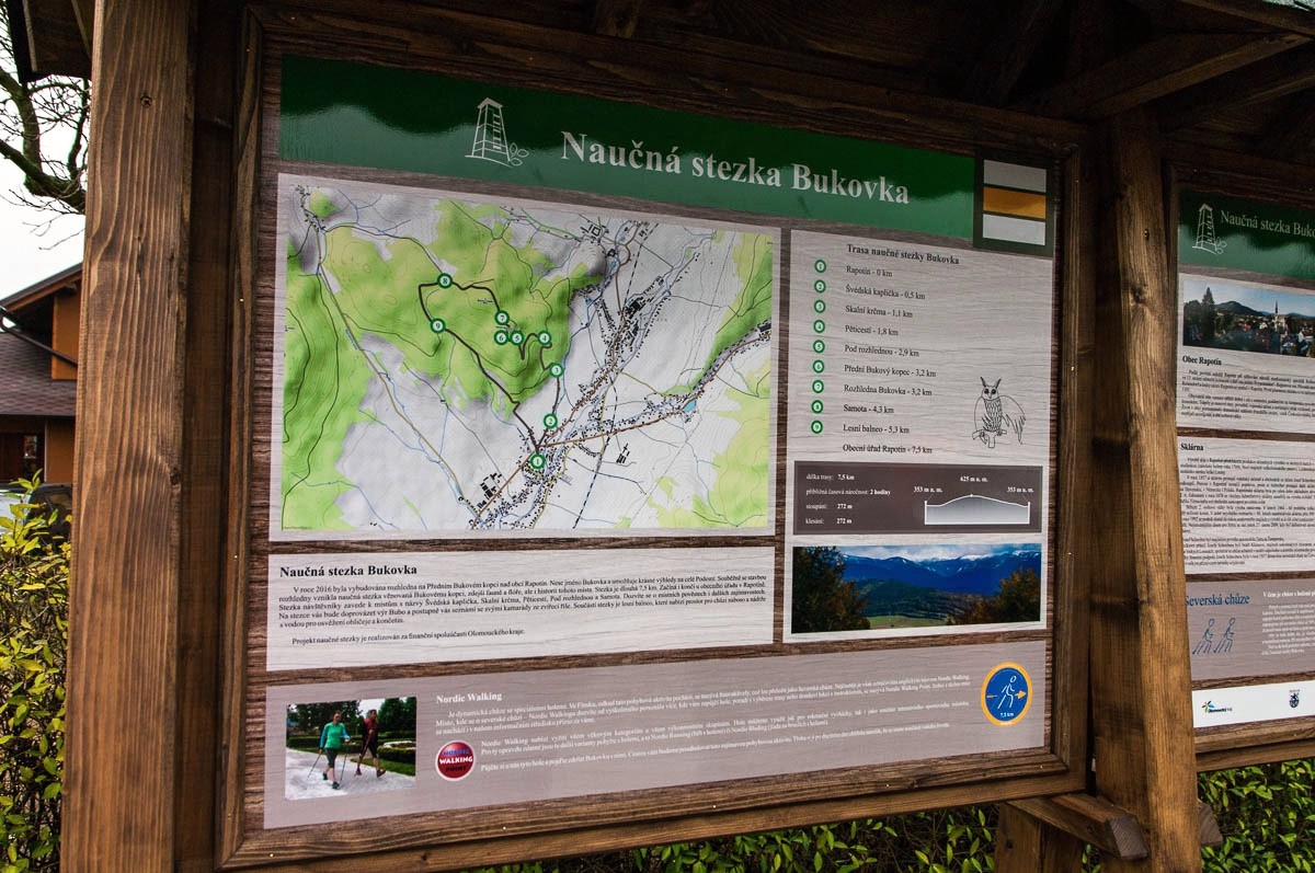 Oficiálně nová značená pěší trasa až u rozcestníku u nedaleko křižovatek silnic 1. třídy č. 11 a 44 (ul. Šumperská a Jesenická), i když defakto je na rohu ulice Lesní, ale velká křižovatka je vzdálená asi 15 m. Výchozím bodem ale nejspíš bude budova místního kulturáku (a radnice) s názvem KKC, která mimo jiné skrývá informační centrum v knihovně. Z budovou radnice se nenápadně krčí připomínka povodní1997 (https://www.turistika.cz/mista/rapotin-povodnovy-kamen), ale většina asi rovnou zamíří k první tabuli naučné stezky, která novou značku provází. Tu najdeme přímo před vchodem do kulturního domu. Po seznámení s texty (a plánem trasy) můžeme přejít silnici a vydat se na trasu. Asi zachováme směr naučné stezky, tedy proti směru hodinových ručiček. Trošku nešťastné byloí, že prvních asi 150 m je podél silnice č. 44, na které je vcelku hustý provoz a v případě větší výpravy je potřeba zvýšit opatrnost. Naštěstí se aktuálně (2019) staví, nebo už je hotový chodník, a asi po nějakých 150 m značka odbočuje do polí a kolem zahrádek (ulička U Losinky) směřuje k úpatí Bukového kopce. Asi v polovině rovinného úseku narazíme u tzv. Švédské kapličky na další zastávku NS.
