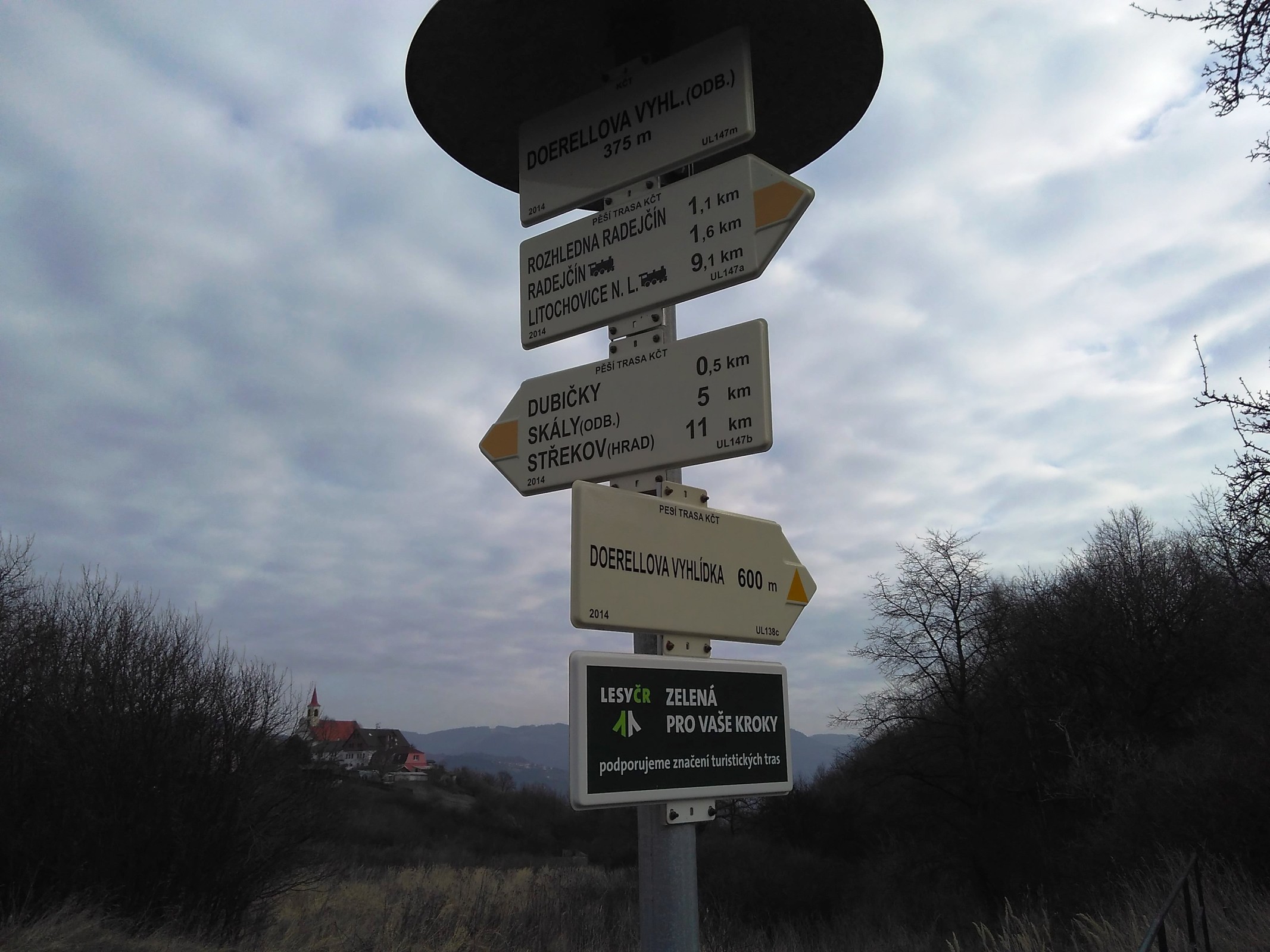 Vyrazíme z parkoviště v obci Dubičky a pomocí místní komunikace se napojíme na žlutou TZ.Asi po 400 m docházíme k rozcestníku a po místním značení dojdeme vrstevnicovou cestou na první vyhlídku do labského údolí - Doerellovu.Vyhlídka je na skalním ostrohu a z lavičky můžeme pozorovat kaňon Labe tkz.Bránu Čech - Porta Bohemica a vrcholky Českého Středohoří.Stejnou cestou se vrátíme k parkovišti.