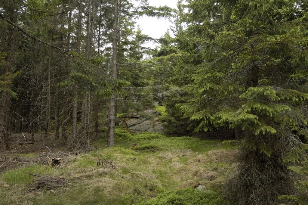 I když je nadmořská výška Orlíkuslušných 1203m/n.m. neposkytuje žádné rozhledy. Vrchol je již porostlý stromy. Dlouho se nezdržujeme a rovnou scházíme lesním průsekem na Medvědí loučky. Z průseku je po pár metrech lesní cesta, my však z ní scházíme a jdeme průsekem, který by nás měl dovést až na Medvědí loučky. Bohužel průsek po asi 100m končí v bažině stromy hustě porostlého rašeliniště. Úsek je dále zcela neprůchodný a tak nám nezbývá nic jiné než se vrátit zpět na lesní cestu. Vzhledem k pokročilejší odpolední době už jdeme jen na jistotu a tak pokračujeme po ní až k rozcestníku Kristovo loučení. Od něj se vracíme zpět, nejdříve po žluté tz. a pak po zelené tz., do Železné.