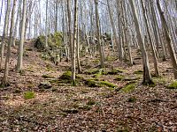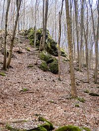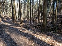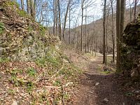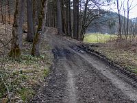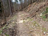 Další část trasy využívá modře značenou cestu. Ta za ostrou zatáčkou pod hradem odchází z lesní cesty (zelená TZ) a samostatnou méně vyježděnou cestou míří k úpatí kopce. Další odbočka ještě prudčeji míří pod svah. Prvotní sešup se postupně mírní, v závěru pak dojde takřka do údolní nivy Moravy. Je klidně možné, že průchozí vyruší hluk motorů, za kolejemi je terénní okruh pro pitbike motocross (je to takový motokros na rovině).