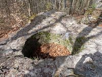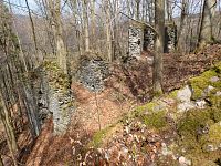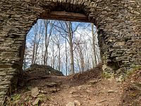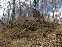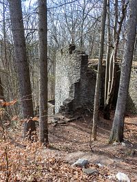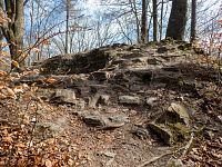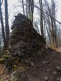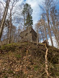 Po obejití spodní části můžeme poněkud krkolomněji vystoupit k nejvyšším částem hradu, kde zřejmě stával válcová věž, po níž v zemi zůstal kruhový základ a zřejmě část zříceného zdiva.