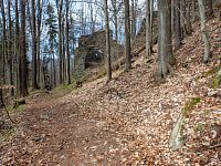 Značená trasa (žlutá) je vedena po lesní cestě, která bývá občas využívaná při těžbě dřeva, ale v současnosti vedou k hradu i mírnější lesní cesty, kterými se lépe pohybuje velká technika. Po nějakých 300 výšlapu je nutno potůček přebrodit, ale většinou vody není moc, tak je to celkem na sucho. Kdo se vzhůru vydá v časně jarním období, nemůže si nepovšimnout poměrně mohutných skalních výchozů, které se zvedají nad cestou. Kdo přemýšlel, kde mohli stavitelé hradu brát materiál, mají částečnou odpověď, ačkoli dá se předpokládat, že větší část kamení dolovali blíže k hradu, před jeho vstupem. Hradní kopec je z převážné části tvořen rulami a svory, což jsou celkem typické horniny Jeseníků (kam vlastně vše kolem řadíme, přesněji jde samozřejmě o Hanušovickou vrchovinu). Prudký výstup netrvá zas tak dlouho (cca 1km), než ve dvou ostrých zatáčkách dorazíme k širší lesní cestě se zelenou TZ od Bohdíkova (to je ta pohodlnější). Ještě další ostřejší zatáčka (tam se připojí modrá TZ z Lužné). Kratší rovinka a jsme pod hradem. Vpravo od cesty si můžeme povšimnout určité díry ve svahu což je zřejmě pozůstatek lomu, kde si stavitelé sebrali větší část materiálu. Kovový rozcestník a šipka na něm prozradí, že k samotnému hradu nám zbývá asi 300 m. Procházíme pozůstatky bývalé hlavní brány a po chvíli vidíme otvor do další již vnitřní části hlavních částí hradu. Hned za vstupem můžeme narazit na výletníky, kteří si tu rozdělali ohníček a něco na něm tepelně upravují (převážně špekáčky). Již zde jsou k vidění zbytky mohutných zdí objektů, kde zřejmě pobývala i posádka hradu. Jak bylo řečeno, hrad byl strážní, tedy vlastně šlo o vojenský objekt, čili hospodářské zázemí zde bylo spíše menšího rázu.