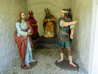 Něco přes sto metrů následuje k zajímavě vyvedené kapli s několika průčelními oblouky, kde nás čeká hned několik sošných výjevů. V prvním výjevu vpravo vidíme mučení a bičování Krista, další by mělo být nasazování trnové koruny a úplně nahoře vidíme výjev Ejhle člověk – Ecce homo. Jak víme, Pilátovi se příliš nelíbilo, že by měl Ježíše vydat katu, zbití mělo bohatě stačit. Nicméně dav ho ukřičel, tak si umyl ruce a dál už to známe.