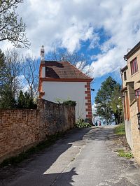 Za křižovatkou následuje méně obvyklá (vzhledem) obdélníková kaple se šikmou střechou. Sochy znázorňují setkání Krista s matkou. Asi 50 m kolem hřbitova s malbou, kde vidíme padajícího Krista a Veroniku s rouškou.