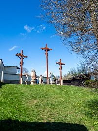 Tvůrci pašijových výjevů vynechali výjev o konci mučení, tedy přibytí na kříž a rovnou ztvárnili výjev Golgoty, tedy Kalvárii s třemi kříži (na stranách odsouzení zločinci). Mezi kříži postav Panny Marie, apoštola Jana a plačící Máří Magdaleny.