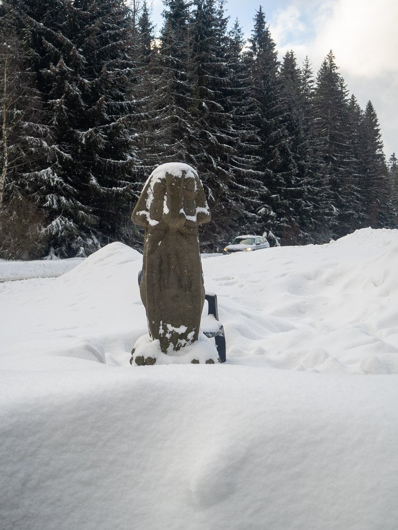 U Škaredé jedle bychom mohli sice podle upravené stopy k motorestu Zastávka, protentokrát ale pokračujeme po silničce přímo. Ta je sice vyhrnutá lesáky, ale nová sněhová přikrývka je evidentěně použitá dalšími běžkaři. V blízkosti obydlí je vyskládáno několik hromad vytěženého dříví, i kvůli tomu se trasa pro běžkaře v lednu neupravovala (ono i tak nebylo co). Označení sídel se plynule mění ze Žďárského Potoka na Starou Ves a protože vlastně jdeme po místní komunikaci, na chvíli běžky sundáme, cesta je posypaná kamínky, tak si nebudeme ničit skluznici.