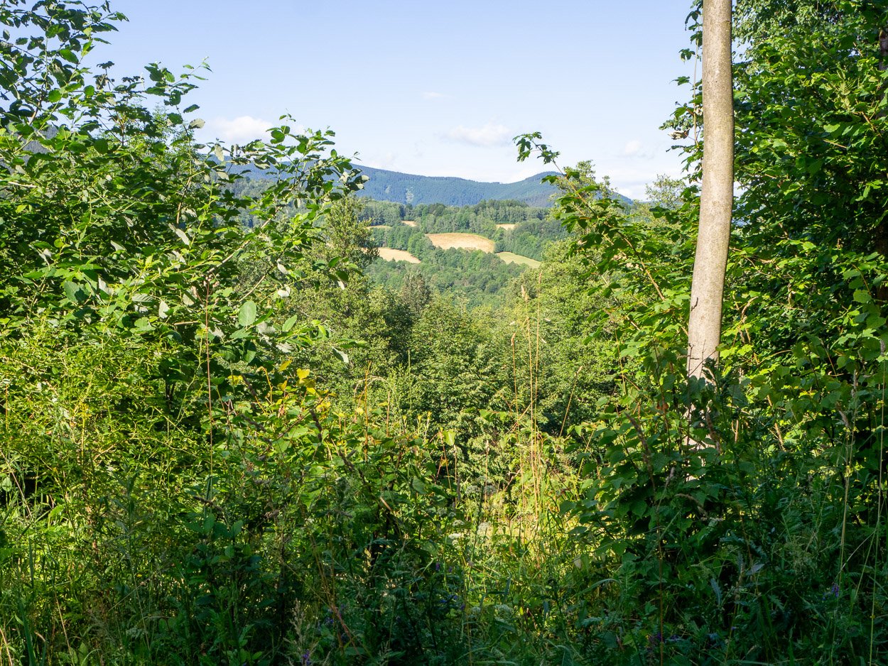 Poblíže vrcholu tedy Havraního vrchu (778 m, něco přes kilometr od Smrčiny) se už konečně svah mírní a kolem vrcholu už můžu opět nasednout.