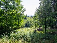 Čekal mě ale ještě výstup na nejvyšší část uvažované trasy. V podstatě nejde o nic neznámého, po červené (a souběžné modré) jsem v minulých letech párkrát prošel (i jel na běžkách), vždy to ale bylo obráceně. No po prvních metrech by bylo lepší kolo nechat doma a vydat se pěšky. Vlastně při obráceném směru mi to nikdy nepřišlo, že kopec je tak prudký, respektive nesjízdný. Je fakt že na obtížnosti se podepsala nedávná těžba kůrovcového dřeva, ale kdo se vydá v mých stopách, tady bude muset s tím tlačením kola zřejmě též počítat.