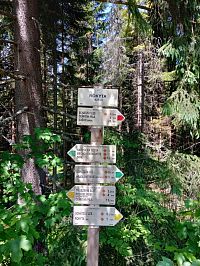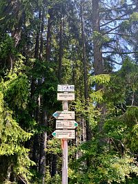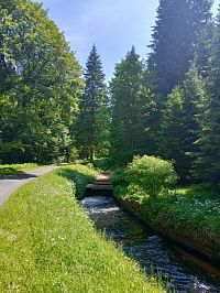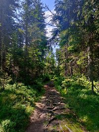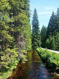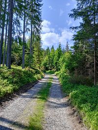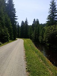 Pohodová nenáročná trasa vás zavede od infocentra v Srní po modré značce podél silnice dolů k rozcestníku Staré Srní. Odsud se vydáte Starým Srním , značka vás vyvádí na cestu ke kanálu ( Vchynicko-Tetovský) .Po pár krocích vpravo je odbočku vzhůru k bývalé Hauswalské kapli......Zde jsem se napojil na naučnou stezku Okolím kostelního vrchu., která po chvíli vede po krásné lesní cestičce a provádí vás pod vrcholem Kostelního vrchu . V části je doprovázena cedulkami se slovy Karla Klostermanna. S přicházejícím klesáním se nabízí výhledy. Cesta se nápoji opět u kanálu. Nedaleko po cestě narazíte na rozcestník Hakešická cesta a změníte modrou za zelenou značku . Podél kanálu pokračujte dál , následují rozcestníky Rokyta , od kterého změníte lesní terén za silnici . Po chvíli dojdete k rozcestníku Schätzův les a před ním odbočíte vlevo dolů po žluté značce. Odsud je to k parkovišti, infocentru a zastávce autobusu už jen malý kousek.