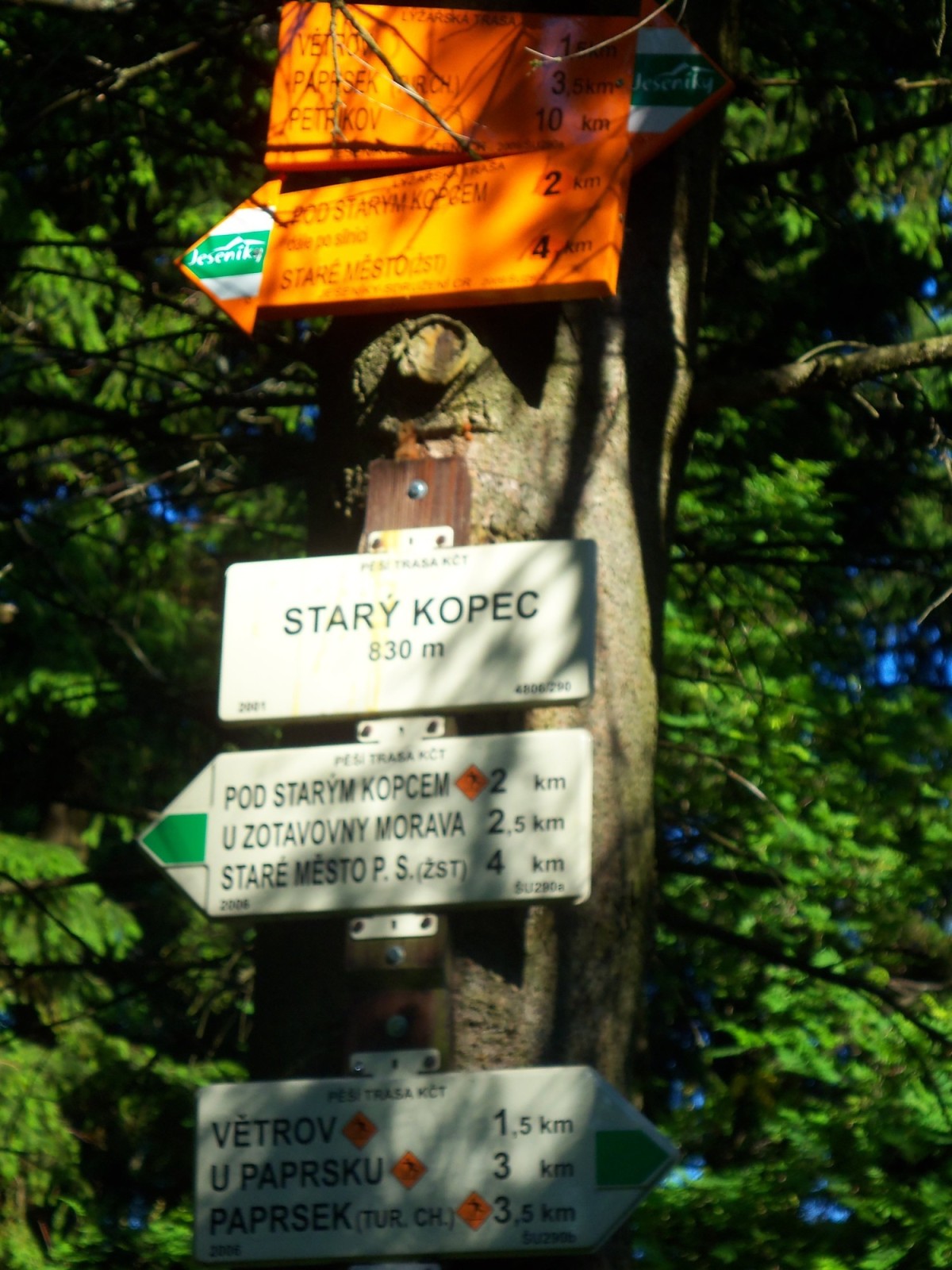Jako start další mé trasy, jsem si vybral Staré Město, kam jsem přijel vlakem. Cesta byla jednoduchá - po zelené do kopce až na Paprsek. Bylo brzy ráno, takže se stoupalo celkem příjemně. Při stoupání po čerstvě posečené louce - (čerstvě doslova, jelikož místní zemědělec se svým traktorem mi dělal kulisu po celou dobu stoupání na Starý kopec) - slunce začalo ukazovat svoji sílu a z posekané trávy se začali rojit hejna much, ale že jich bylo, možná to bylo tím počasím, možná tím, že jsem se pohyboval jako zdechlina. Na Starém kopci jsem se nemohl ani pořádně vydýchat, jelikož v mžiku jsem byl ozdoben hromadou bzučícího hmyzu, takže jsem rychle prchnul na další výšinu Větrov. Kopec naštěstí dostál svého jména, takže jsem se krásně ochladil. Při stoupání k Paprsku lesní cestou, mě předjelo né moc zrovna teréní vozidlo se 4členou posádkou. Asi po pár metrech co mě auto předjelo, se vozidlo zastavilo a muži vystoupili ven. Při míjení jsem si všiml, jak se sestoupili u přední kapoty a kolem jejich hlav se zvedala jakási bílá pára, která nevěstila nic dobrého. Raději jsem se nesmál, jelikož mi bylo jasné, že v tuto chvíli by humor neakceptovali. U Paprsku jsem odbočil po čevené směrem k Medvědí boudě. Cesta byla klidná a nenáročná. Od Medvědí boudy jsem začal stoupat po neznačené lesní cestě na Kunčický hřbet a odtut se pak napojil na zelenou trasu, která mě dovedla až na vrchol Polské hory. Z Polské hory následovala po zelené značně dlouhá, nenáročná a také celkem nudná cesta až Na Králický Sněžník. Cestou jsem minul pár Poláků, tvářili se ještě přátelsky, to však ještě netušili, že večer jim naši fotbalisté ukončí působení na domácím Euru. Při vytlapání až na vrchol Králičáku, jsem zjistil, že po Polské trase je mnohem více klidu, skoro jsem šel sám, ale při pohledu o pár metrů vedle, to na české trase vypadalo jako na Václaváku. Takže jsem se moc dlouho nezdržel a jelikož mi už nezbyla žádná voda, uháněl jsem dolů po červené k prameni Moravy doplnit zásoby. Nutno podotknout, že tam byla celkem fronta, ale po napití jsem cítil velmi příjemný chlad. Po sestoupení k Stříbrnickému sedlu, jsem se vydal po modré na další stoupání směrem k vrcholu Sušina. Tentokráte ovšem nevím proč tento název, když cesta byla celkem zdatně podmáčená rašeliništěmi a mini jezírky. Ze Sušiny jsem pak klesal po čevené a míjel pár Řopíků. Poté jsem už celkem unavený sešel z červené a napojil se na asfaltku, která mě zavedla prudce dolů, přes cyklotrasu opět na červenou a po ní jsem v klidu došel na vlak do Vysokých Žibřidovic.