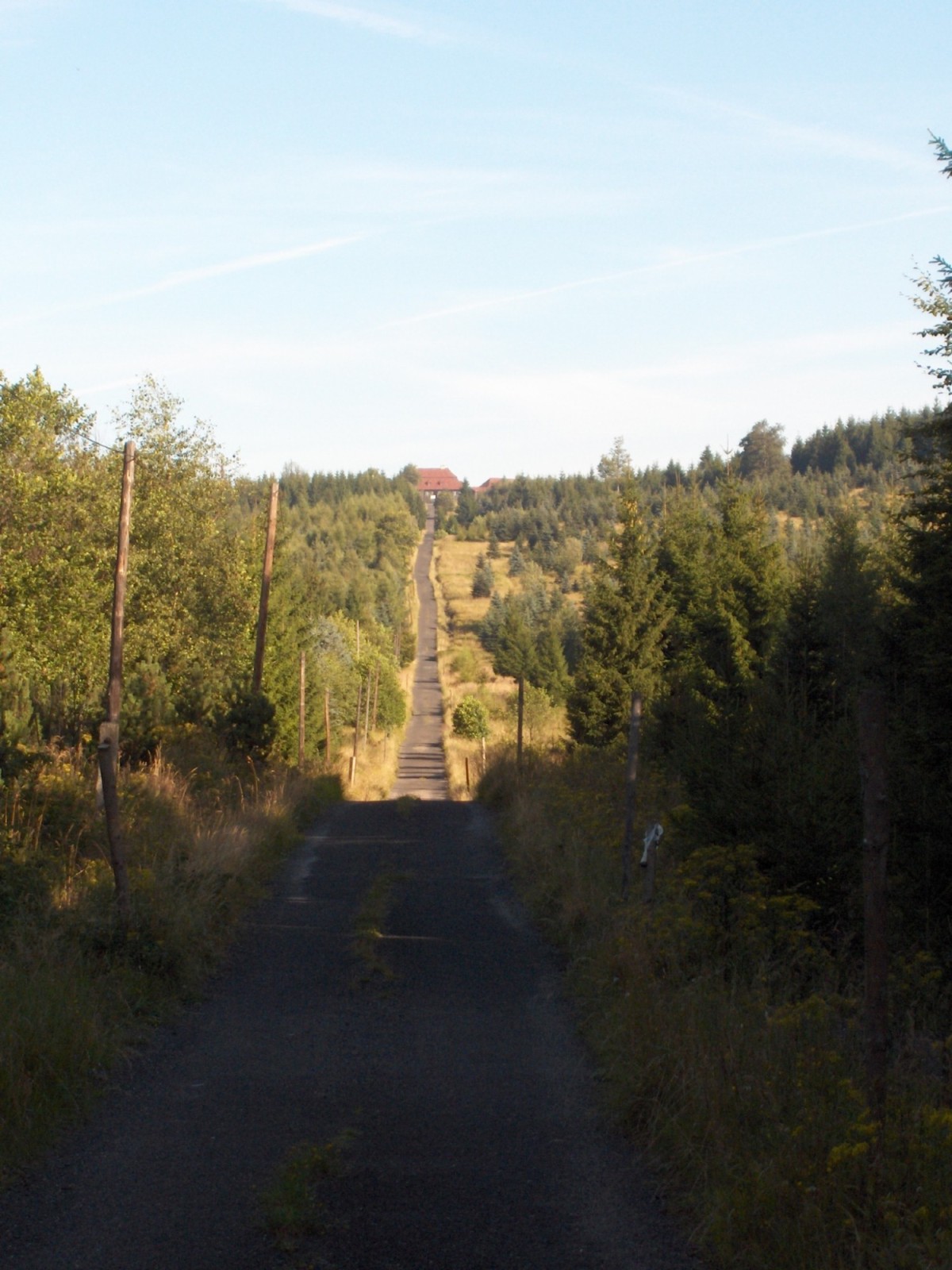 Autobusem jsem jel z Litvínova směrem na Český Jiřetín. Vystoupil jsem na křižovatce cest u obory a po asfaltové silničce jsem pomalu 2 km stoupal na návrší Bradáčov /876 m/, které má na jedné straně hraniční údolí Pstružného potoka a na druhé straně Flájskou přehradu.Na vrcholu je bývalý Lovecký zámeček Lichtenwald , dnes nazýván jen Zámeček. Teď je na prodej.