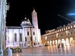 Ascoli Piceno - vstup do kostela San Francesco z Piazza del Popolo a socha papeže Julia II.