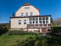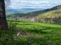 U penzionu je zřízená vyhlídková plošina, z které je ale díky vzrostlým stromům spíše omezený výhled na údolí Moravy. Ze vzdálených vrcholků se mi podařilo odhadnout Keprník a Vozka.