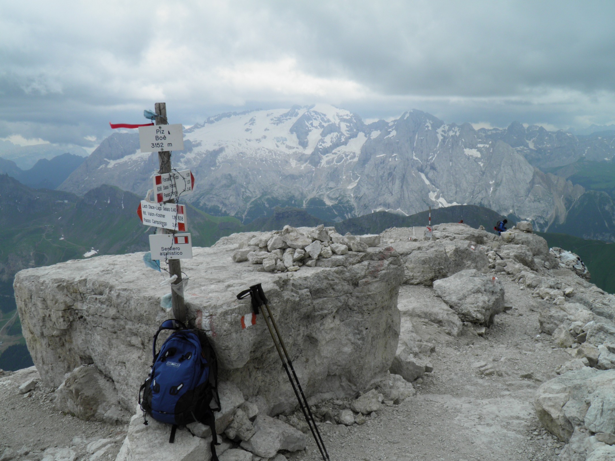 Na poslední den našeho pobytu v italských Dolomitech jsme si nechali další lahůdku - zdolání vrcholu Piz Boe. Autem jsme vyjeli na parkoviště na Passo Pordoi. Protože na odpoledne hlásili výrazné zhoršení počasí /déštˇa vítr/, tak jsme se rozhodli první úsek na Sass Pordoi absolvovat lanovkou. Někteří z nás žbrblali, ale teprve pozdě odpoledne jsme toto rozhodnutí docenili....