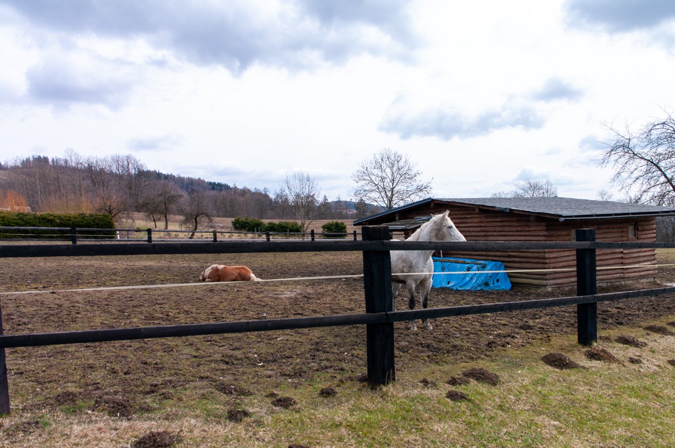 Tolik k částečné lokaci výchozího místa. Použití busu má svůj prozaický účel – ušetřit si cestu do kopce. Kupodivu poměrně dost turistů nebo výletníků využilo podobnou možnost jako naše skupinka, ale většina z nich nám brzy zmizela z dohledu, patrně i díky tomu, že vyrazili poněkud odlišným směrem, po modré TZ k chatové osadě pod Lužnou s možností návštěvy zříceniny Nového hradu, my vyrážíme v podstatě přesně opačně. Sledujme polní cestu, která je ovšem značně rozježděná a rozblácená pohyby zemědělské techniky, takže si to šineme spíš volně louko, přesněji pastvinou, která ale ještě čeká na ozelenění a příchod pasoucích se stád dobytka. Po zimě se zatím nový růst nijak neprojevil.
