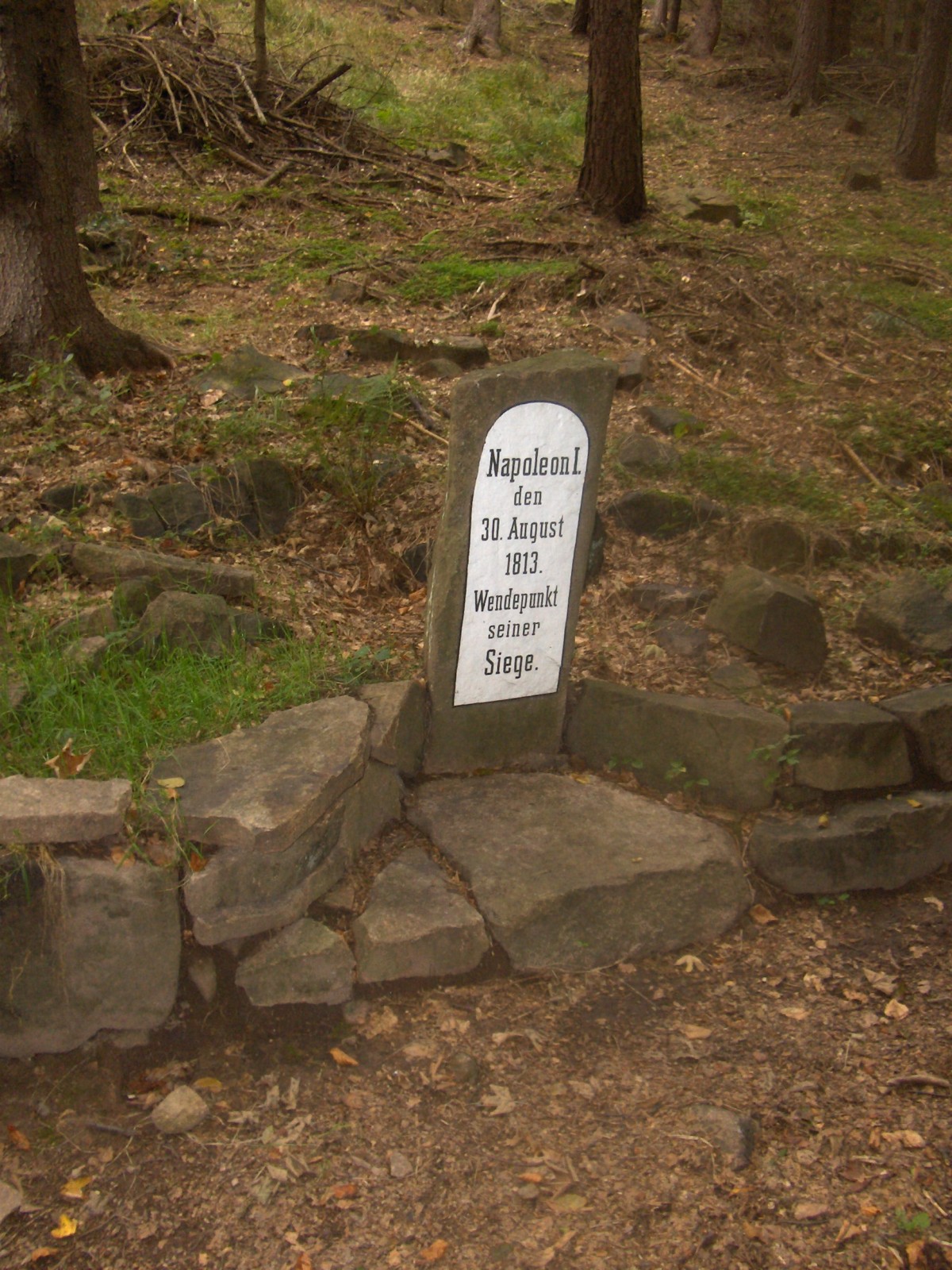 | Opomíjená památka v lesích nad Dubím. Poražená rakousko-ruská vojska v bitvě u Drážďan ustupovala přes Krušné hory v oblasti Cínovce. Nad Dubím se postavila proti francouzským vojákům, kteří je pronásledovali. V následující bitvě bylo francouzské vojsko poraženo. Na památku této bitvy byl zde postaven pomníček. Ten byl nedávno opraven. Na pomníčku je nápis Napoleon I. 30.8.1813 - bod zvratu jeho vítězství. Neznačenou lesní cestou od pomníčku se vracím do Dubí. | ||||