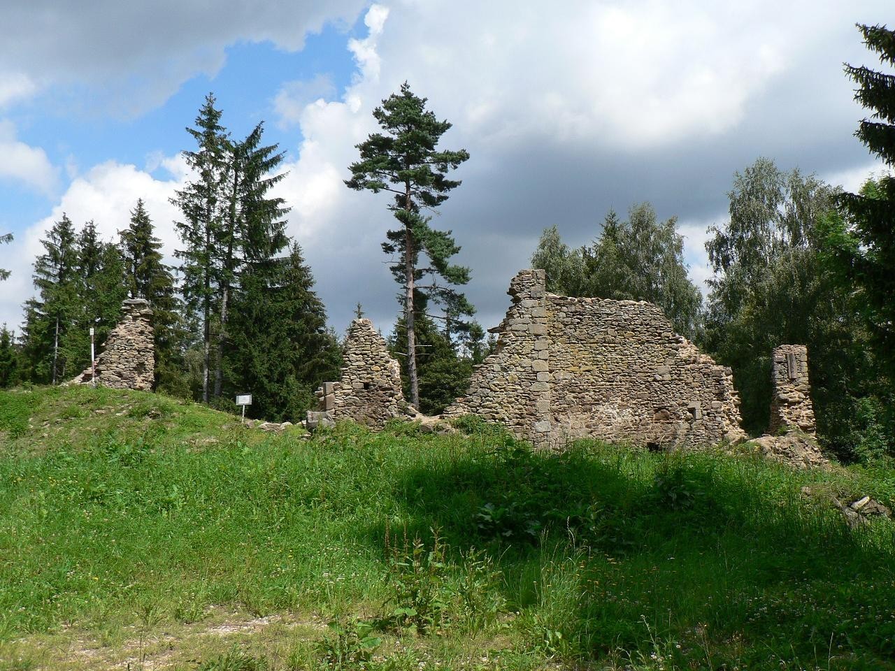 Romantická zřícenina kostela sv. Bartoloměje se nachází na rozhraní Šumavského podhůří a vlastní Šumavy. Historie kostela je více než zajímavá. Byl farním kostelem nedaleké vísky Podolí a farníci dělali všechno možné, aby se kostela zbavili. Po mnoha letech se jim to za panování císaře Josefa II podařilo.A tak tento gotický kostel, který zde stál od roku 1370, byl v roce 1788 opuštěn. Poté již následoval zánik a v 19.století byl kostel zbořen. Ale i to, co zbylo, za návštěvu stojí. U jedné ze zdí je zbytek nádoby na svěcenou vodu, najdou se i části kamenných konsol. Pod cestou jsou zbytky další stavby, zřejmě bývalé fary a byl zde i hřbitov. Objekt i jeho okolí jsou vzorně udržovány a romantické duše se zde cítí jako doma. V srpnu je zde, na svátek patrona kostela, sloužena mše za značné účasti věřících z Čech i Bavorska. Vede tudy Vintířova poutní stezka. Nedaleko odtud na sever je vrch Boudovka ( 729 m.n.m.). V minulosti to bylo místo zcela zapovězené. Za komunistů tady byla raketová základna. Přesněji řečeno palebné postavení raketového pluku z nedalekých Janovic nad Úhlavou. Ten zde měl umístěny protiletadlové komplety KUB. Revoluce přinesla zánik a z celé základny zbyla cesta z betonových panelů a chátrající oplocení. Vše ostatní bylo odstraněno a prostor dostala příroda. A ta se opravdu činila. Les břízek, borovic a několika dalších druhů stromů je skoro neproniknutelný. Spodní patro ovládly mechy a vřes. Na několika malých loučkách zabraly prostor trávy a květiny. Orchideje zastupují skoro půlmetrové kruštíky - Epipactis helleborine. V přírodě již málo vídaná zeměžluč - Centaurium erythraea barví loučky do růžové a z naší přírody rychle mizející hruštička - Pirola rotundifolia zde našla také podmínky pro život. Pochopitelně, že výčet druhů květin není konečný. Při zběžném počítání se číslo blíží k padesáti taxonům a to spousta dalších má dobu květu za sebou. V mnoha případech se jedná o rostliny chráněné a jen Bůh ví, kde se to všechno tady vzalo. Neuvěřitelně vysoké jsou i zdejší janovce. Některé keře dosahují téměř 4 m výšky. A tak by se mohlo pokračovat dál, ale i čtenáře je možné unavit. Přesto tento učebnicový příklad obnovy přírodního prostředí, bez zásahu člověka, je unikátní.