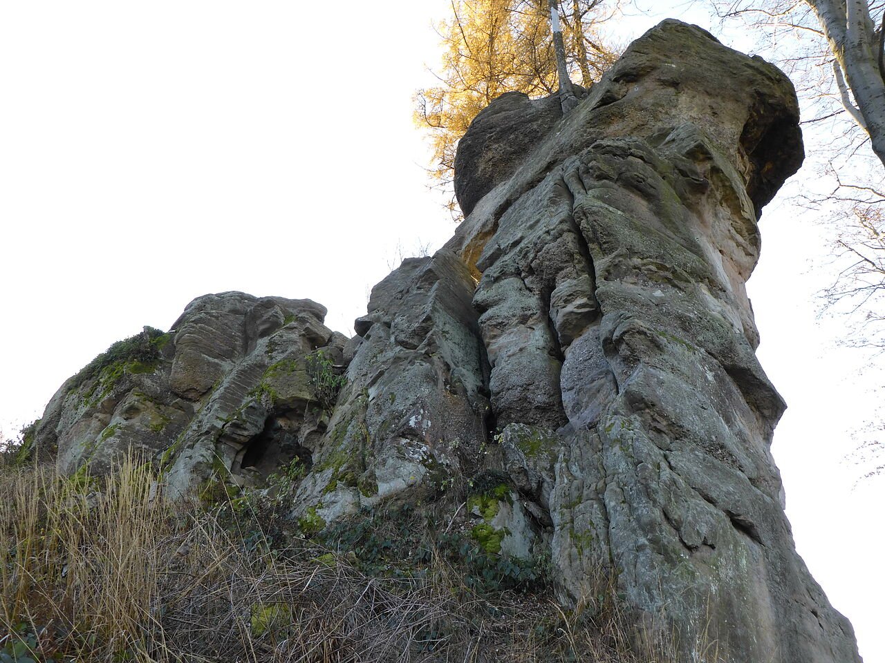 Kotník byl během týdne ještě dost napuchlý a dlouhá modřina se nejrůzněji „vybarvovala“, pěknou fialovou barvu měly i prsty na této noze. Inu náraz to byl asi skutečně „pěkný“. Naštěstí při běžné chůzi již noha problém nedělala, postup do kopce byl vcelku také v pohodě, ale bylo mi jasné, že pokus udělat si od skály „Severka“ zkratku přímo dolů k cestě po níž jsem chtěl pokračovat dále, může být pro tuto nohu „křest ohněm“. Na skále je krásné místo, kde se dá vyzkoušet vezení „rozporem“, ale protože bylo mokro, po lezecké „sezóně“ a kotník na tyto „hlouposti“ zcela nepoužitelný, tak mě to ani nenapadlo. NO…. Napadlo… :-))) Hlavně jsem přemýšlel jestli se spořádaně vrátit ve směru kterým jsem zde přišel nebo ušetřit cestu a čas (?) přímým sestupem. Nakonec jsem uviděl nenápadnou pěšinku a tou se vydal dolů. Ošemetné bylo především to, že sestupová noha byla ta „kotníková“. Za jakékoliv podklouznutí nebo náraz bych se hodně „poděkoval“. Rozloučil jsem se se skálou u které jsem byl po velmi dlouhé době a viděl ji zase z úplně jiných úhlů a opět mě úplně nadchla.