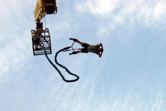 Bungee z jeřábu probíhá také z výšky 50 metrů v Brně a na dalších místech – v Praze, Olomouci, Plzni a Ostravě.