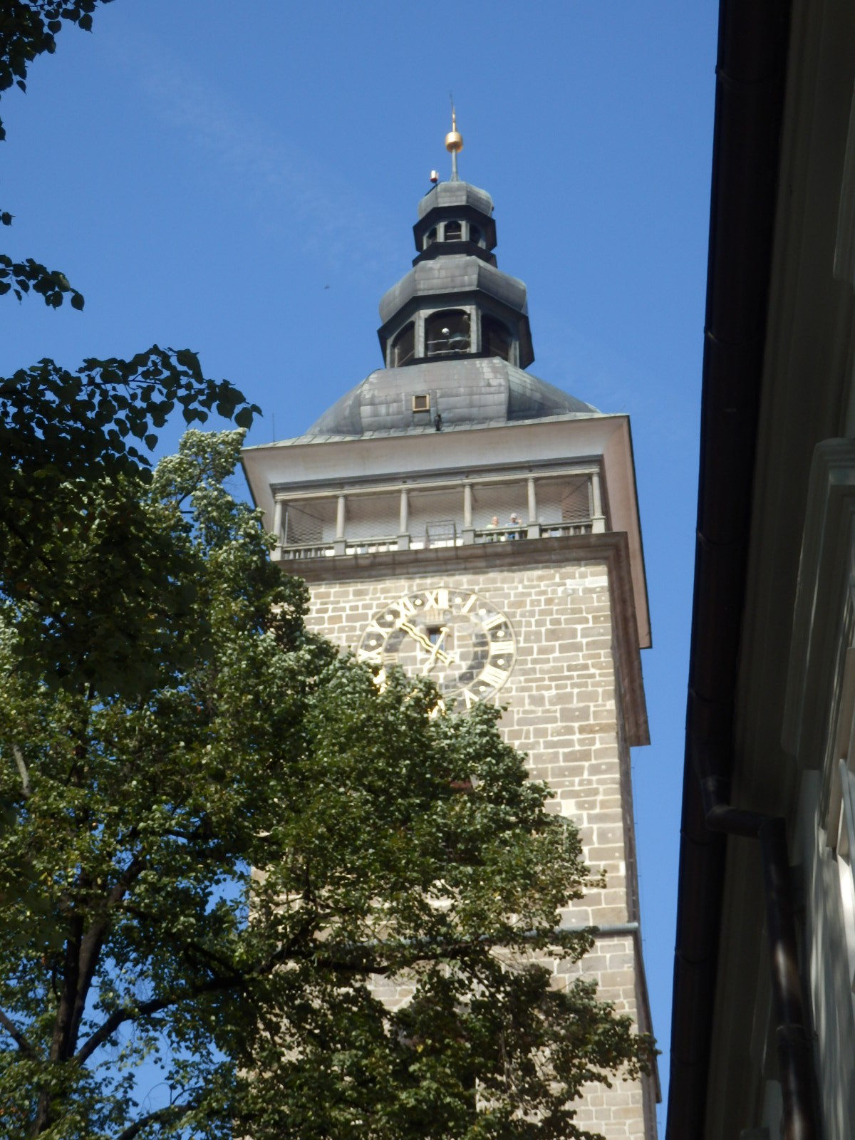 Jedná se o městskou renesanční věž z šestnáctého století obývanou až do roku 1950. Stavba sloužila jako strážní věž a zvonice. Do dnešního dne je zde několik zvonů. V oficiálním a aktuálním letáku se píše o pěti, my jsme viděli jen tři. Je možné, že jsme v pološeru dva přehlédli. Každý den v poledne zvoní nejnovější zvon Budvar z roku 1995. Ostatní zvony jsou mnohem starší (1684-1723).