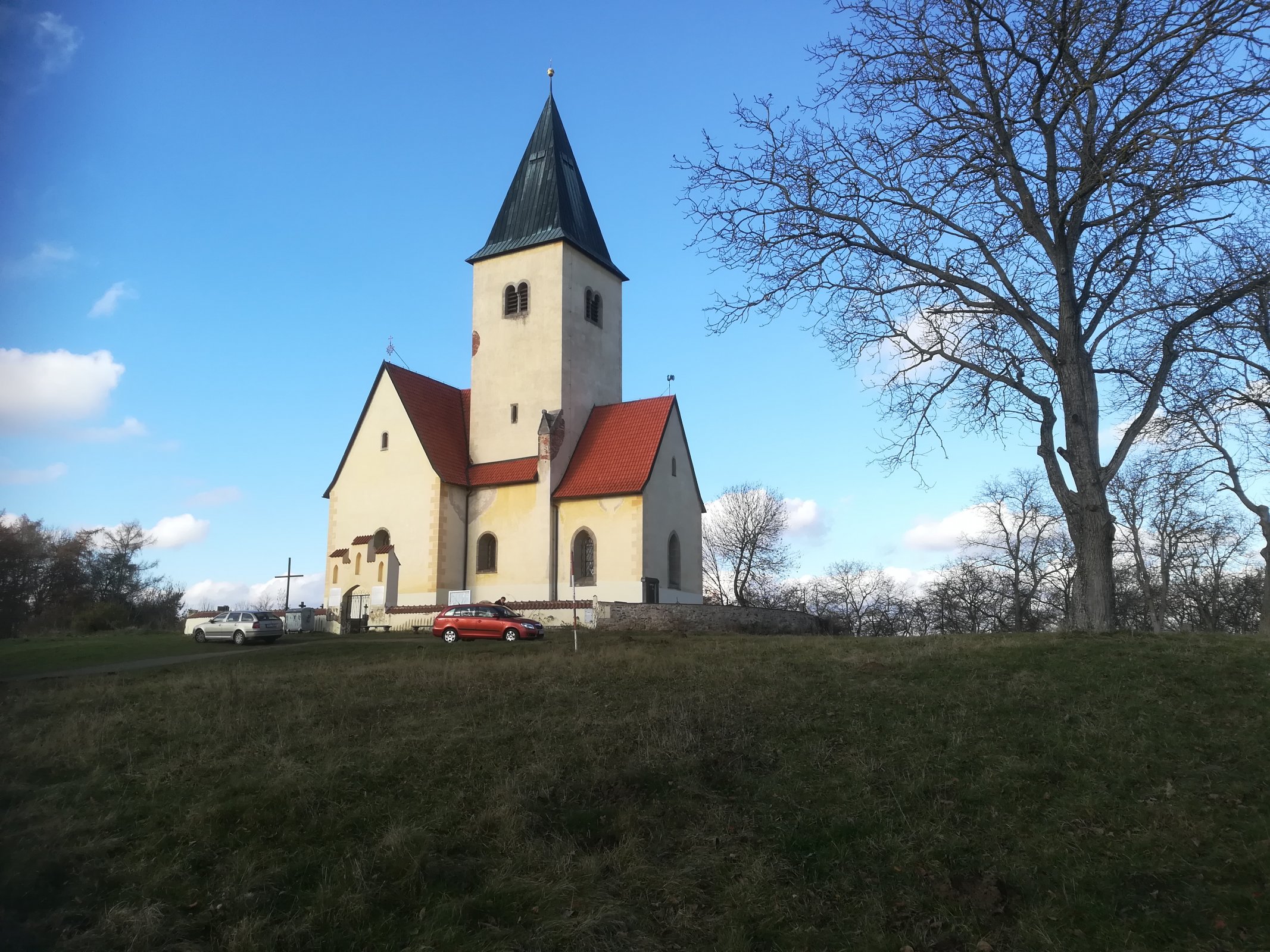 Krásný výhled do kraje a příjemný pocit, když přijdete ke kostelíku a sednete si na lavičku