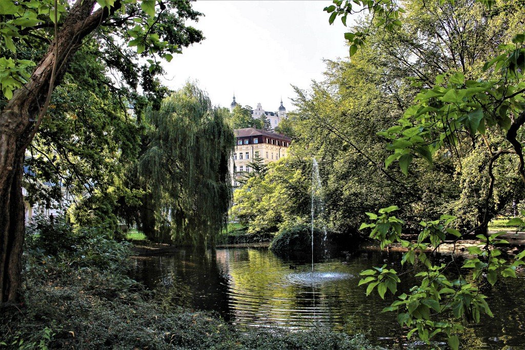 I tady je otevřena jen zahrádka restaurace. Je tu ale více turistů a po rozhlédnutí z rozhledny na město a jeho okolí se jde na pivko. Horko je stále větší a tak volíme sestup lesem k interhotelu Pupp. Parčíkem procházíme k Císařským lázním, které se také opravují. V parčíku je socha Karla IV. a kousek za budovou lázní kostelík sv. Petra a Pavla. Po pravém břehu řeky se vracíme na nábřeží. Divadelní náměstí je místem, kde je budova divadla. Novobarokní stavba byla postavena mezi roky 1884 až 1886. Vřídlo je také v opravě a nás vítá Vřídelní kolonáda. Uvnitř je jen několik lidí a tak lze i posedět. Nelze vynechat návštěvu nejvýznamnější sakrální stavby města, kostela sv. Máří Magdaleny. Byl postaven mezi roky 1732 až 1736 a můžeme do vnitřku i nahlédnout. Ze schodiště kostela je zajímavý výhled směrem k řece. Vracíme se na nábřeží. Je tady stanoviště drožek, které také čekají na zákazníky. Jdeme Vřídelní ulicí a po pravém břehu Teplé docházíme k hotelu Thermal. Den je skoro za námi a tak zbývá vrátit se k autobusovému nádraží. Přecházíme řeku a kolem obelisku pokračujeme na nádraží a z odjíždějícího autobusu se loučíme s městem, které pozorného turistu dokáže okouzlit.