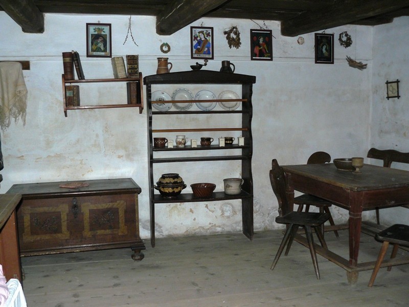 Poslední prohlídky jsou v domku ševce a výměnkářky - kořenářky, tady už nás ovšem zbylo jen pár. Postupné záhadné ubývání seniorů se záhy vysvětlilo: mizeli do koštovny zdejší palírny. My zbylí jsme kroutili hlavami nad tím, kolik předmětů z posledních dvou domků měly naše babičky doma, hrnky počínaje, světle modrými kastroly pokračuje a cedníky konče. Co všechno během posledních několika desítek let zmizelo v propadlišti dějin...