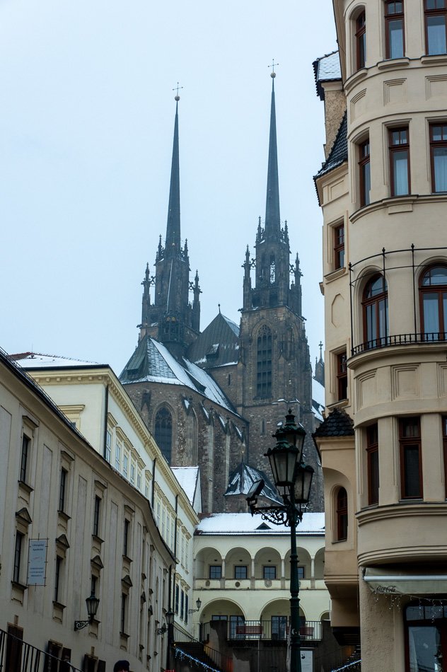 Po celkem vydatném pátečním sněžení jsou ještě patrné zbytky bílé hmoty i v brněnských exteriérech, čili navození předvánoční atmosféry je vcelku stylové.