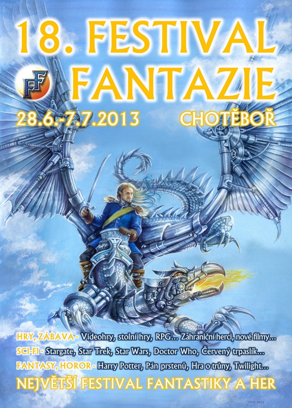 18. Festival fantazie proběhne v Chotěboři od 28. 6. do 7. 7. 2013. Čtyři budovy a venkovní prostor nabídnou světově unikátní program pro příznivce nejen sci-fi, fantasy a hororu v hrách, filmech, seriálech, anime, comicsech, literatuře a podobně. 18. Festival fantazie přináší desítky filmů, 1200 pořadů, velkou videohernu a hernu stolních her i slavné zahraniční hosty.
