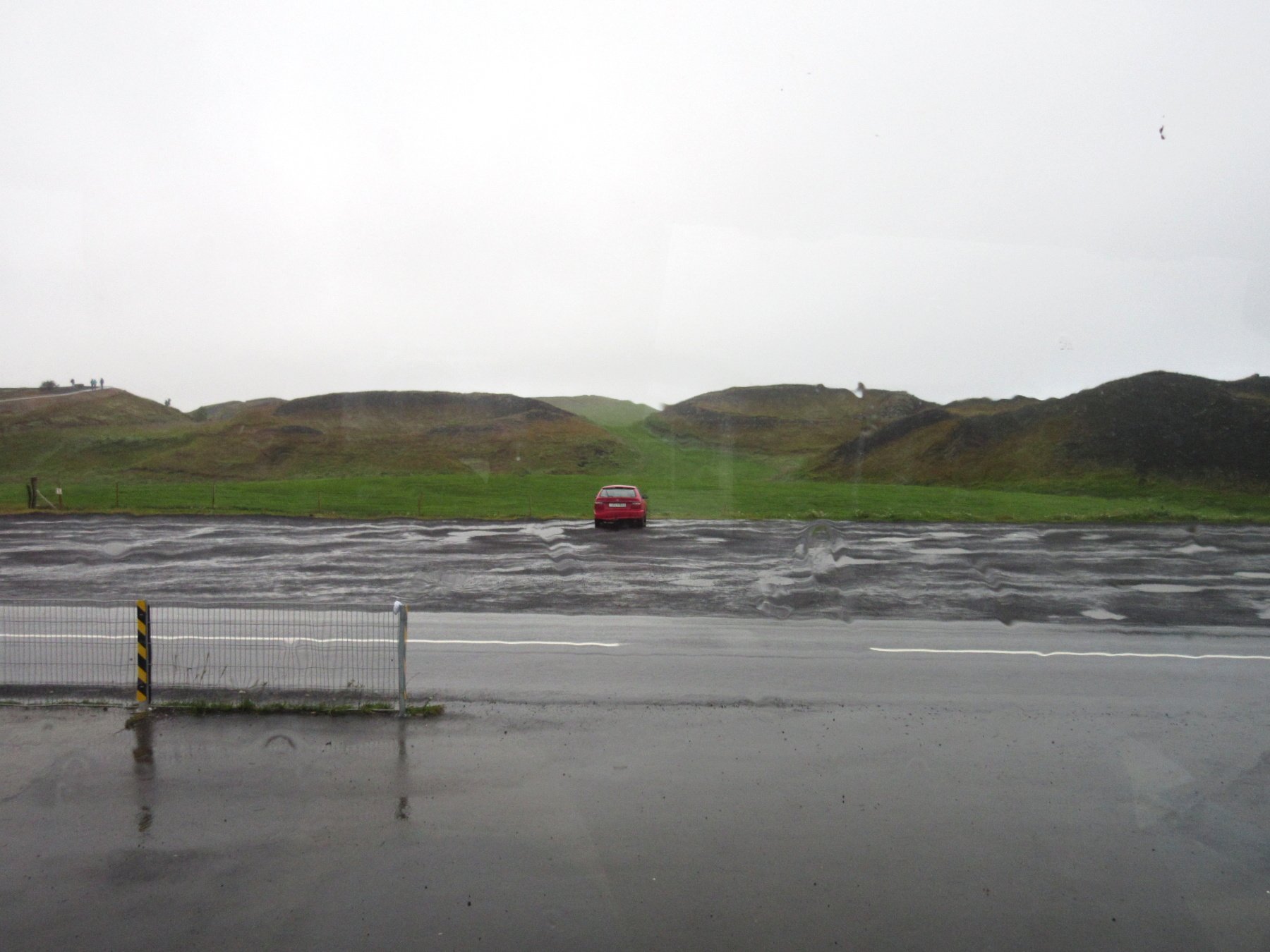 My jsme do kempu na východní straně jezera přijeli od jihu. Ze silnice č. 1 jsme odbočili po silnici 848. Na této silnici je parkoviště hned na okraji oblasti Pseudo-craters Skútustadagígar. Tyto pseudokrátery, které vznikly v době zhruba před 2300 lety, jak jsem psala viz výše, jsou vidět hned z autobusu. Na první pohled to vypadá jako zajímavé travnaté kopečky, na vrcholu jsou však důlky, které vypadají jako malé sopečné krátery. Ty vznikly, když si pára z vnitřku prorazila cestu ven. Z těchto kráterů láva nikdy netekla. Jsou různě veliké, největší má v průměru přes 300 metrů. Fotku mám pouze z autobusu, protože v tom lijáku, který nás zde zastihl to venku fotit ani nešlo.